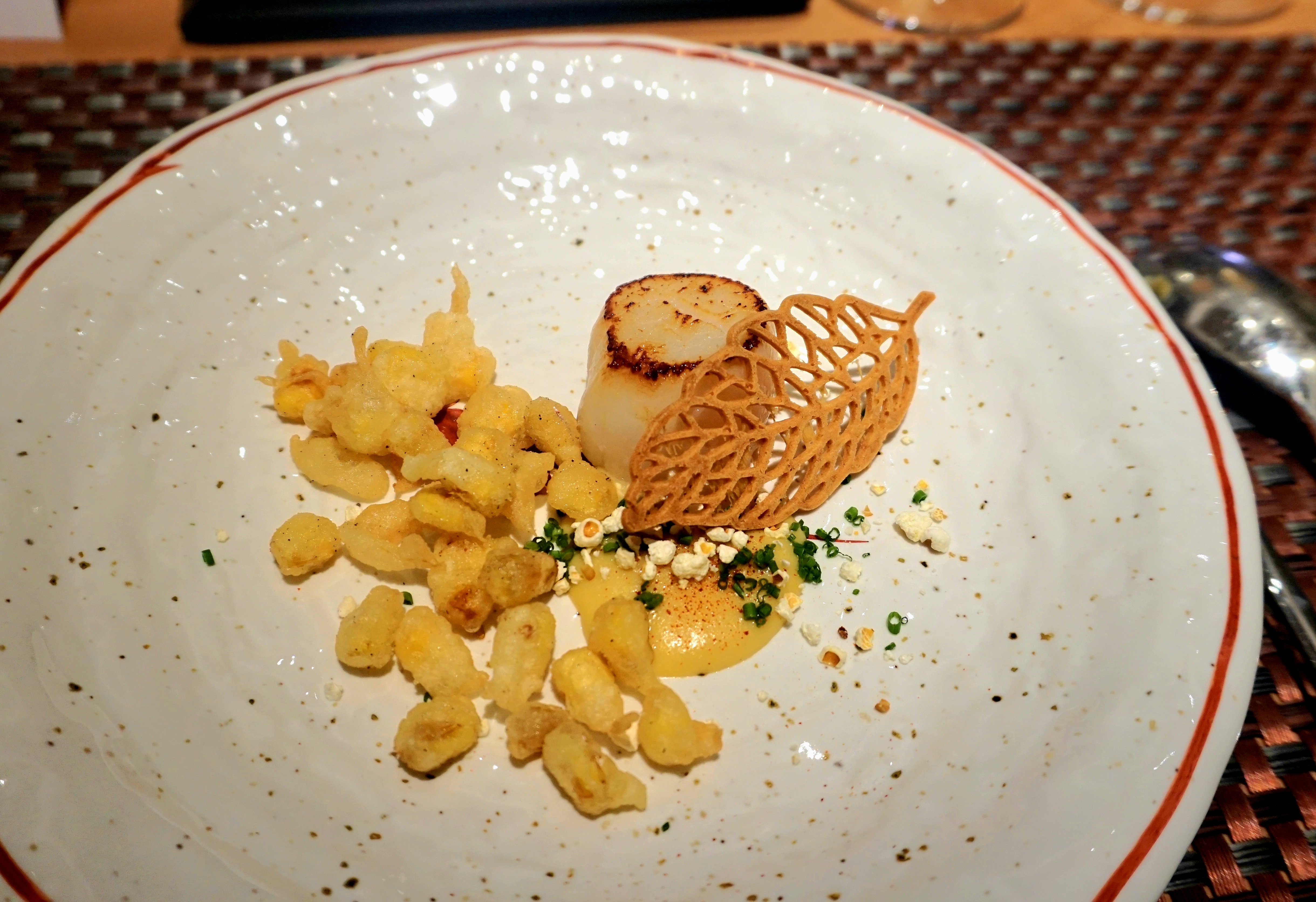除了對台灣經典小吃的鐵板新譯外,Will拆解食材型態,與各類風味相互搭配出的獨特料理亦是令人驚喜,其中最令筆者印象深刻的便是「干貝.玉米.玉米.玉米」,此道料理亦是開業至今不變的經典菜色。選用北海道生食級干貝以鐵板煎烤至外層微焦而內部溼潤柔嫩,搭配清甜的水果玉米醬汁、玉米天婦羅、爆米花和玉米鬚風味脆片點綴。干貝多汁鮮甜的口感會在第一口直衝味蕾,水果玉米醬汁則讓海潮退去後以其溫潤甘甜的口感包覆舌蕾,玉米天婦羅、爆米花和玉米鬚脆餅則以三種不同的酥脆口感在舌尖跳躍,若說干貝是以鮮甜海味讓舌尖衝浪,那麼玉米的多變型態則好似上岸之後在暖陽照耀的沙灘上舞動狂歡,由海至陸的風味交疊既讓口中留下綿長尾韻,亦讓海陸之間的甘甜氣息交織出極富趣味又不失和諧的巧妙協奏。