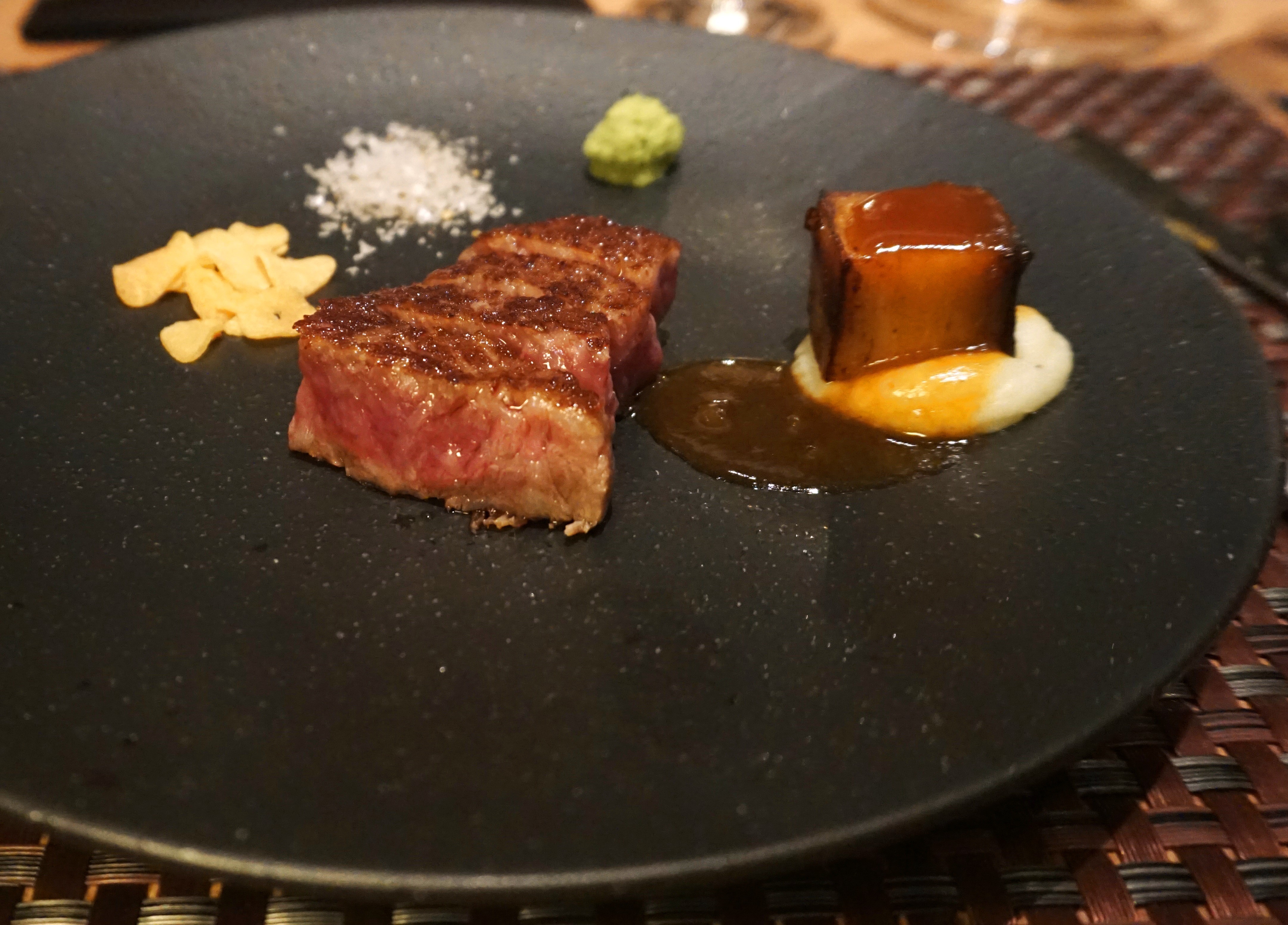 再將牛肉搭配芥末、蒜片、胡椒鹽等不同調料,刺激味蕾變化,使油脂不膩而留下柔和的甘美之氣。搭配自製的馬鈴薯千層沾附與大量蔬菜和牛肉熬煮的肉汁,讓澱粉、蔬菜的甜香與肉質的甘韻交疊,呈現極其柔美的餘韻。
