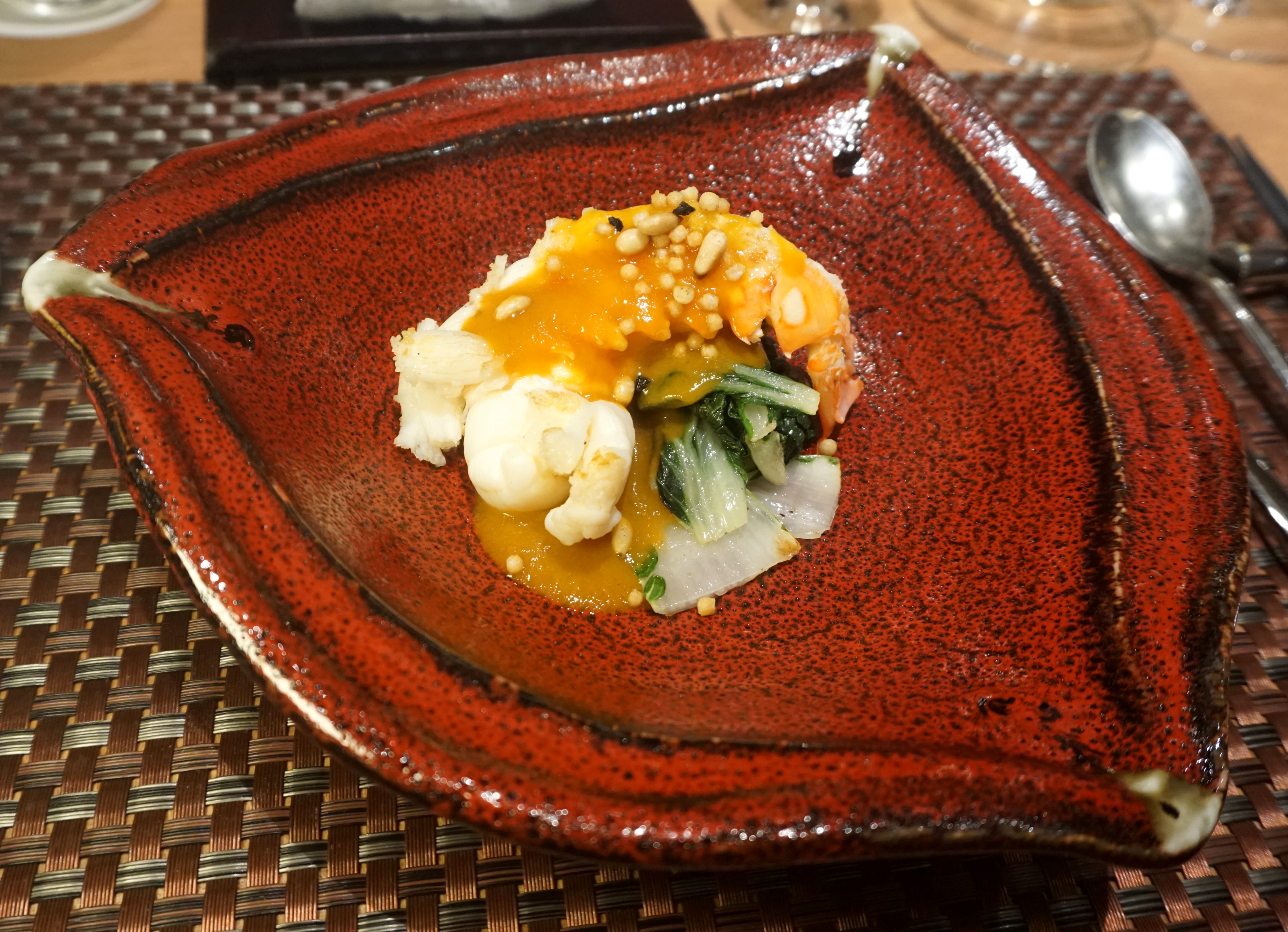 搭配以龍蝦頭、胡蘿蔔與大量蝦膏熬煮的特製醬汁,堆疊出鹹鮮濃郁的海味本質。細膩的奶油白菜增添柔潤底蘊,佐以松子、米果與黑橄欖增添脆香與風味層次。