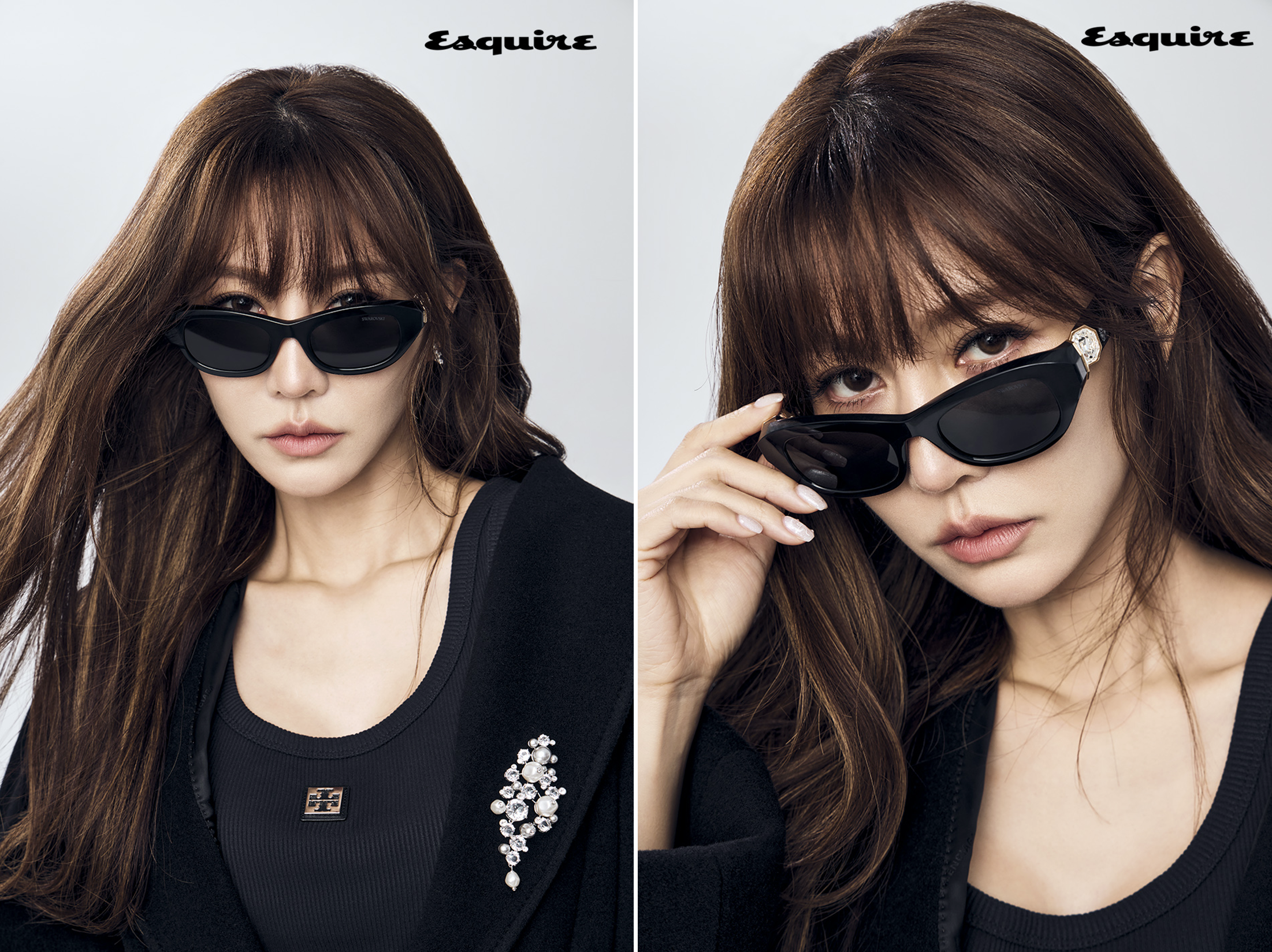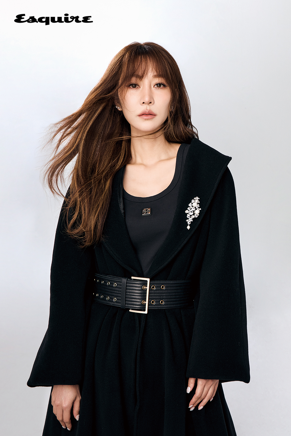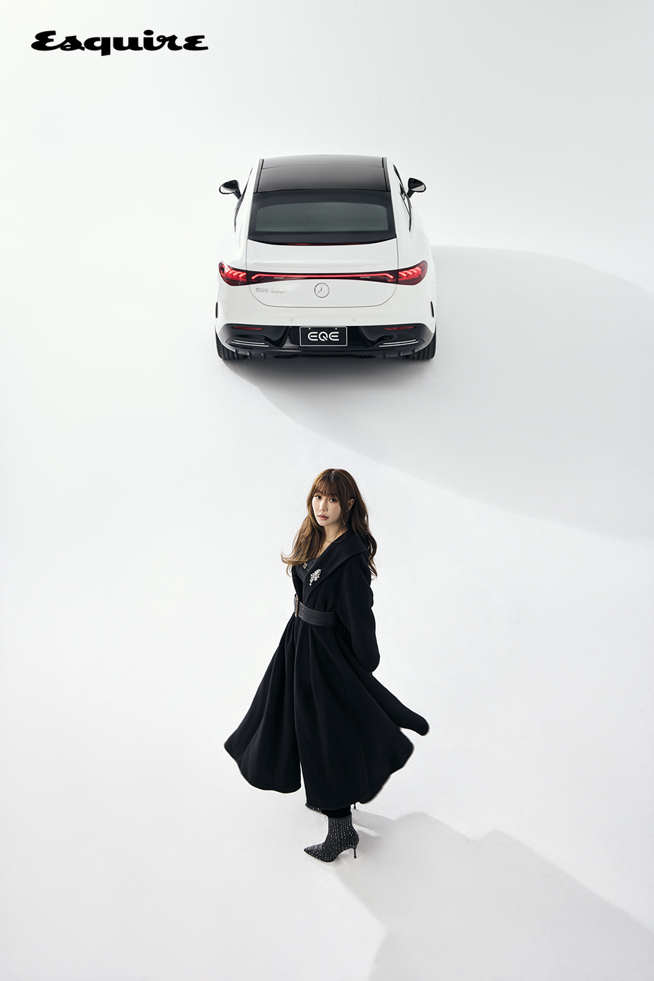 黑色大衣 by Balenciaga;黑色背心 by Tory Burch;黑色絲絨長褲 by Balmain;鑽飾胸針 by Swarovski;腰封、鉚釘短靴 by Allsaints;EQE 350+ by Mercedes-Benz