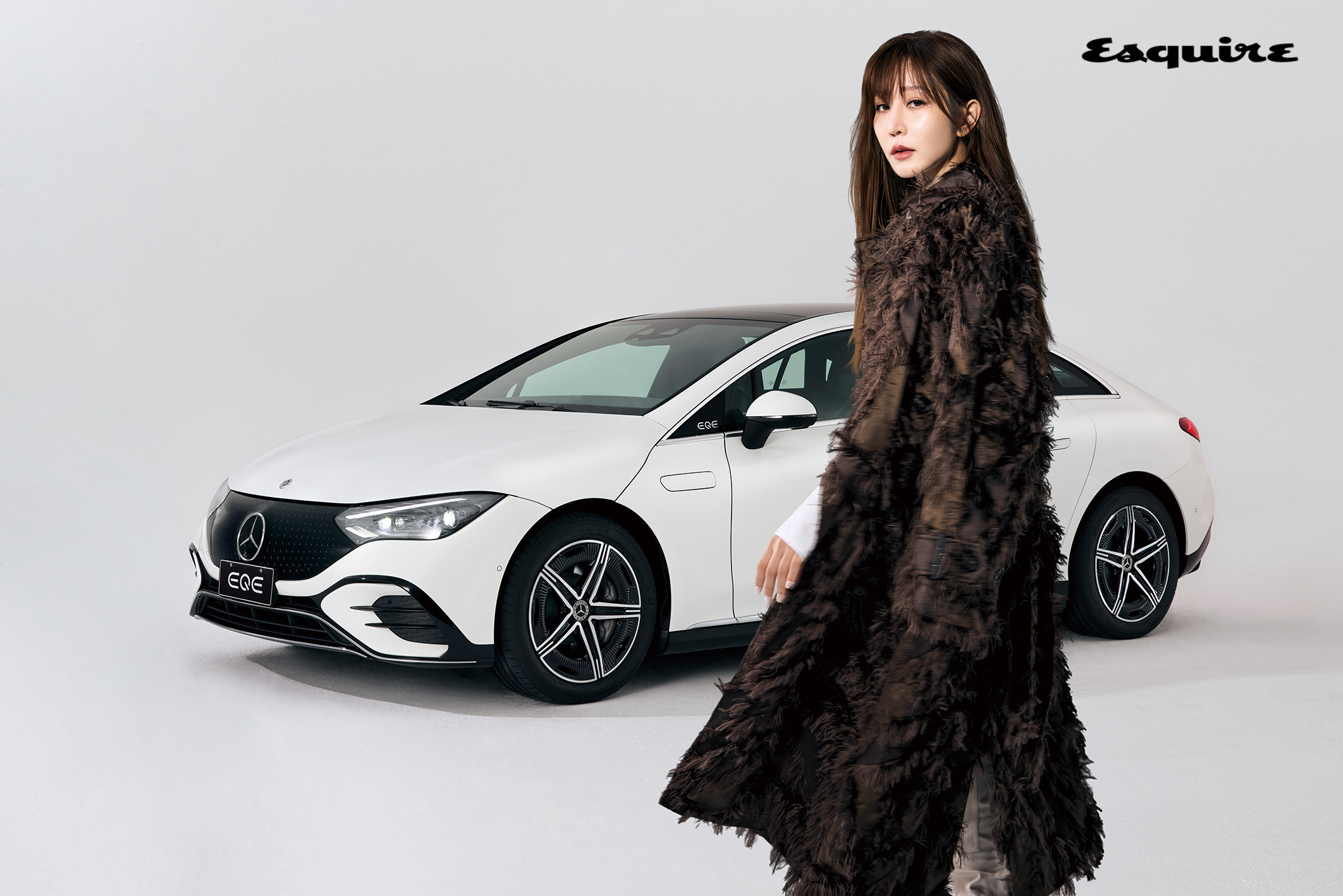 白色襯衫、咖啡色馬術背心、白色馬褲 by Brunello Cucinelli;EQE 350+ by Mercedes-Benz