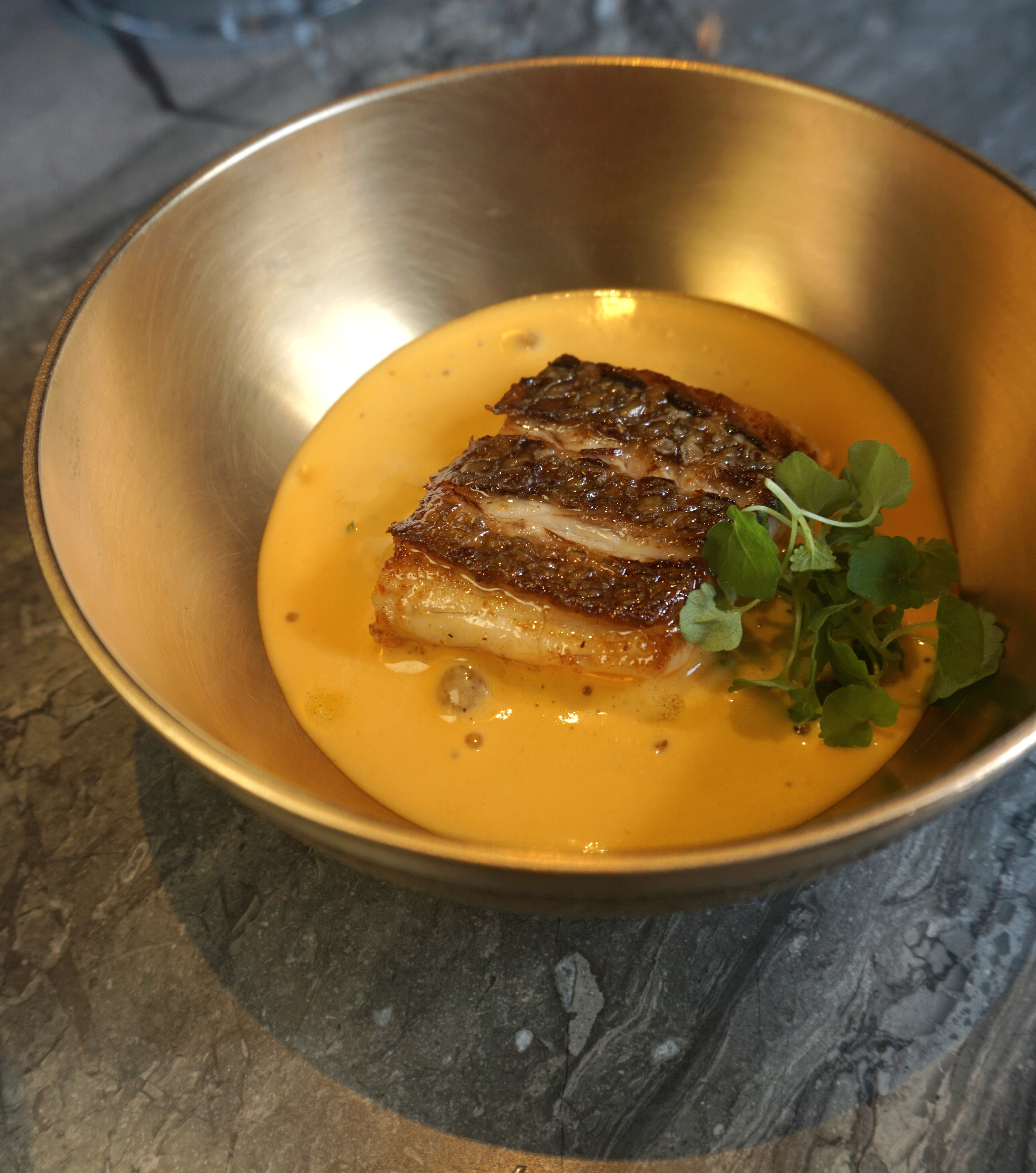 以濃厚的口感對味蕾做出第一道重擊後「紅甘 柚子 紫蘇」卻又即刻讓人從濃辛的意象中抽離,在輕重之間營造令人意猶未盡的風味搭配。此道料理以韓式冷麵為發想,選用細緻的紅甘,搭配滑順素麵,柚子胡椒為基底的冷湯加入些許的韓式辣醬,以酸香微辛的滋味勾勒出清爽而又豐富的味覺層次,更進一步襯托出魚肉的鮮味、平衡油脂感,令人品嘗時眼睛為之一亮,搭配酥炸紫蘇則進一步增添草本香氣。