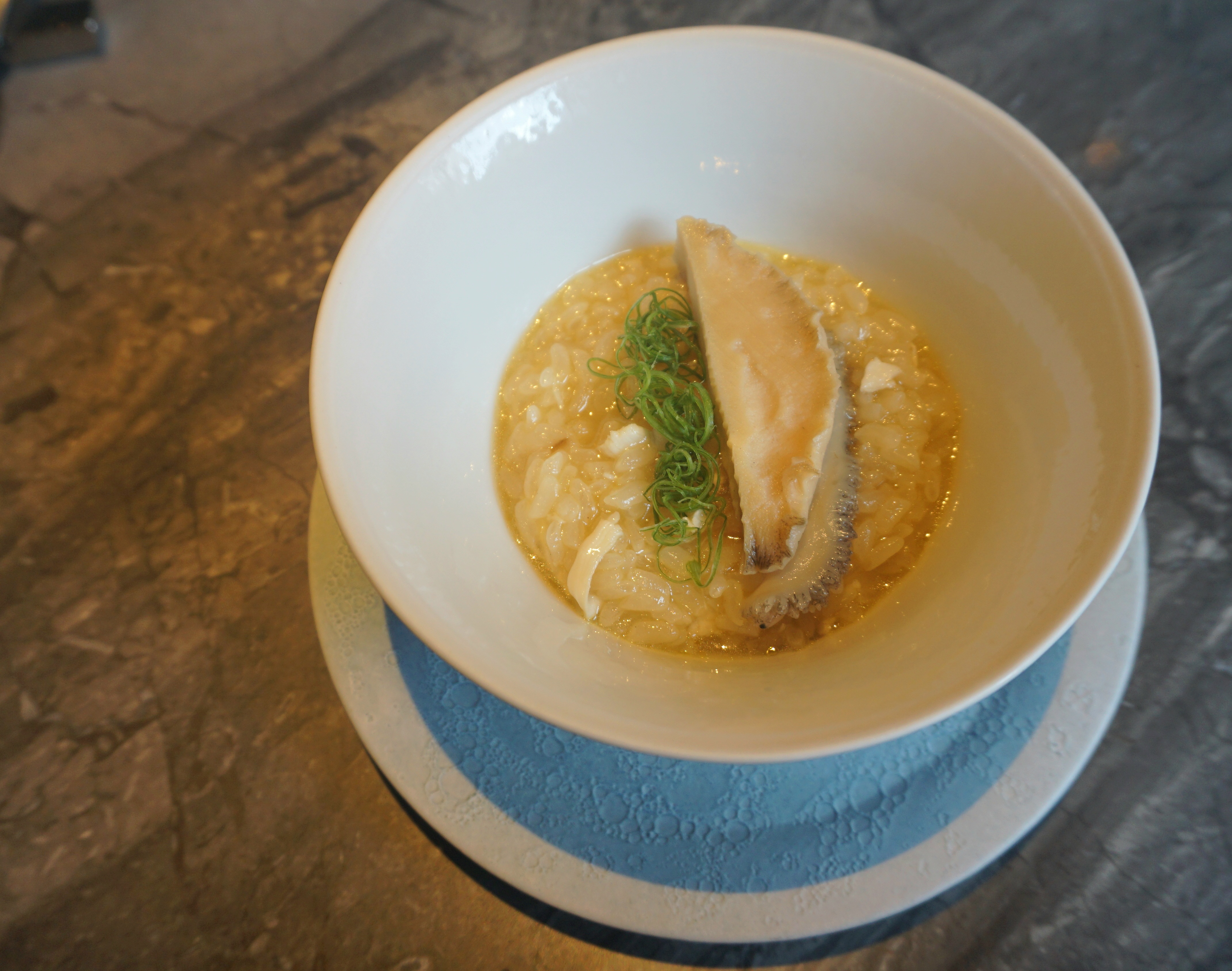 「鮑魚 人蔘 竹地雞」以韓式鮑魚蔘雞湯為靈感,將糯米先以人蔘雞湯慢火熬煮,綿柔的米粒在口中運開人蔘厚實的香氣,搭配鮑魚的彈牙鮮美帶來一絲輕盈口感。單純品嘗米粒燉煮入味的風情後,再進一步將溫熱的雞白湯注入碗中,濃稠的膠質感讓雞骨與油脂構築出的濃醇滋味與蔘湯的溫潤相融合,不僅在味蕾間構築交響,更是暖心暖胃,令人回味無窮。