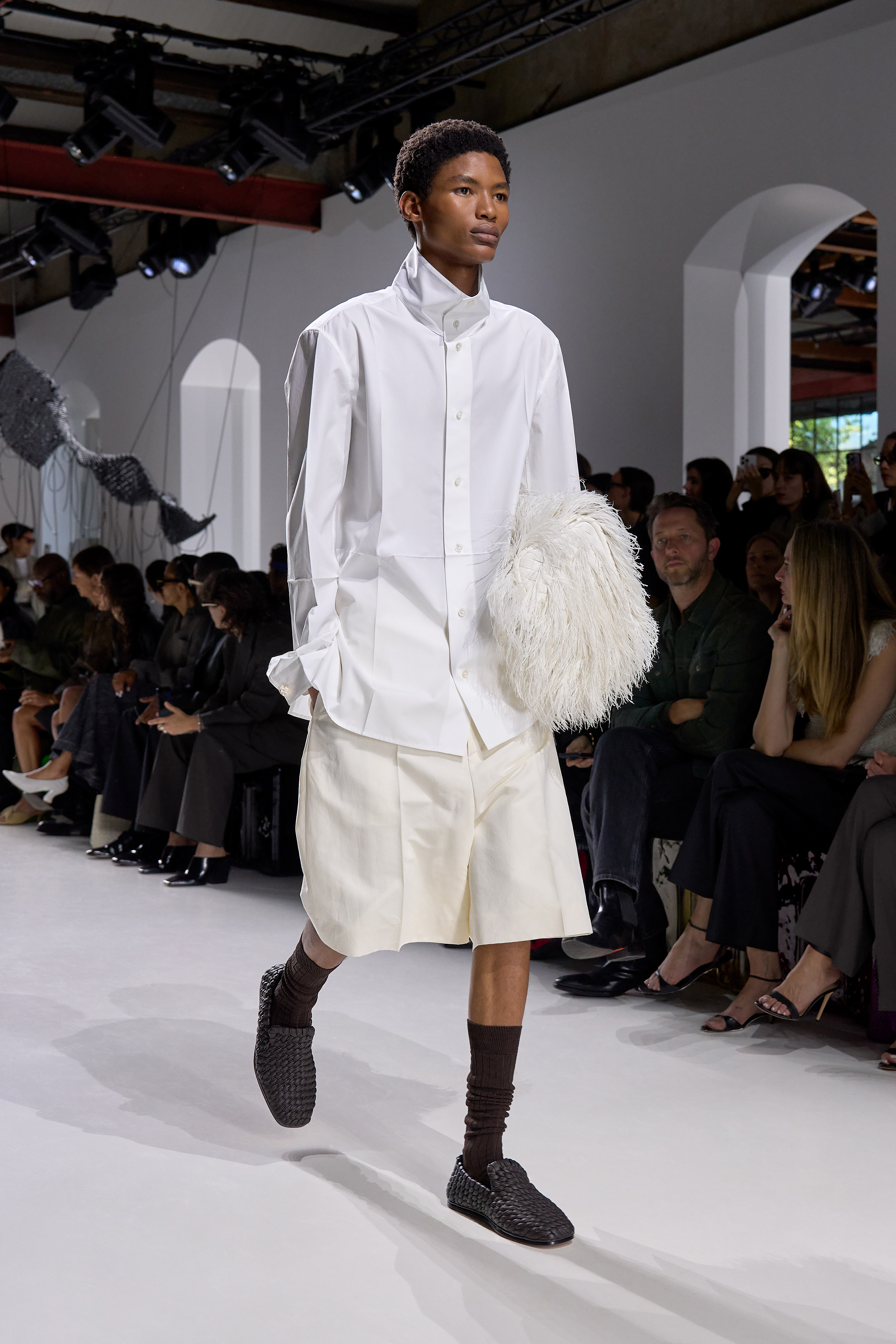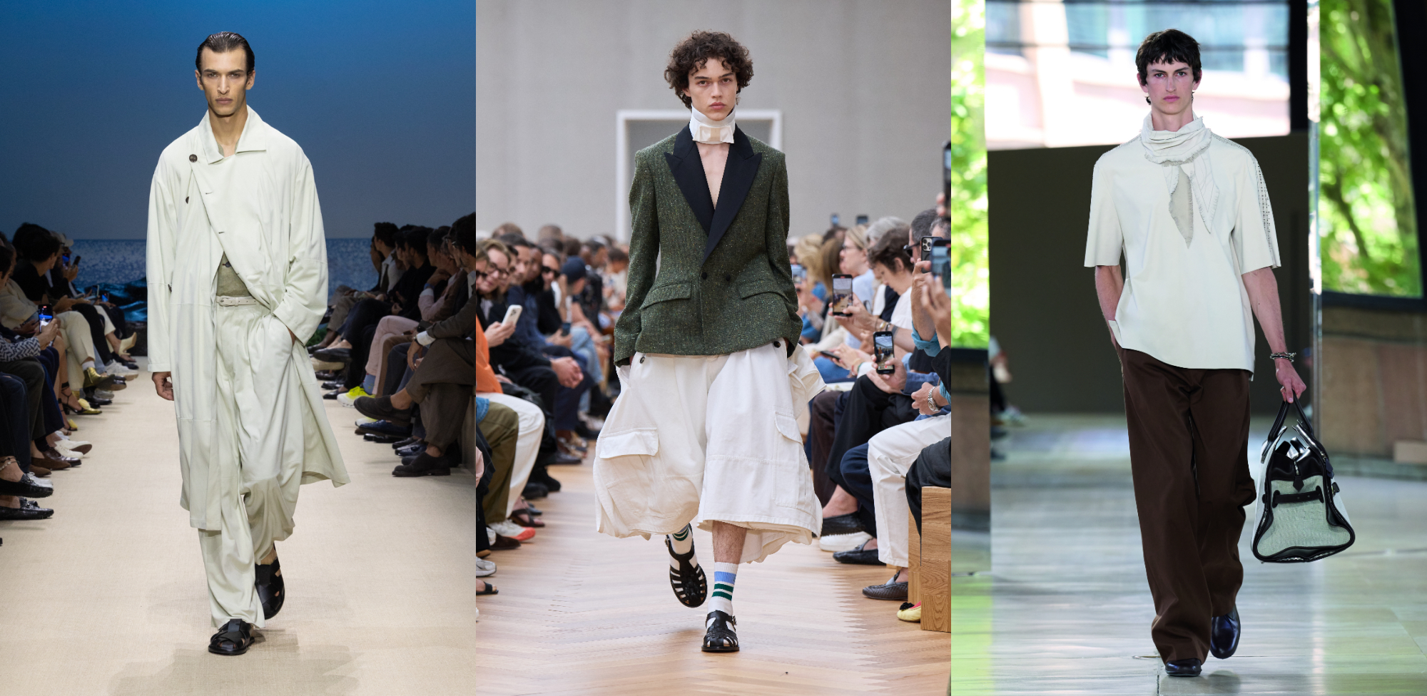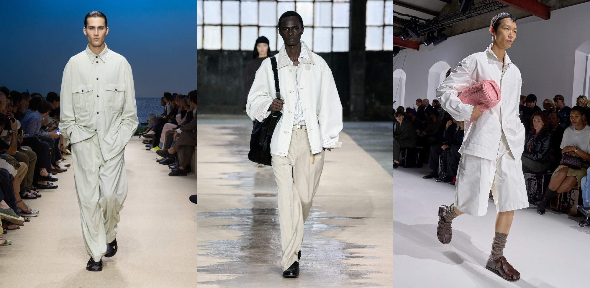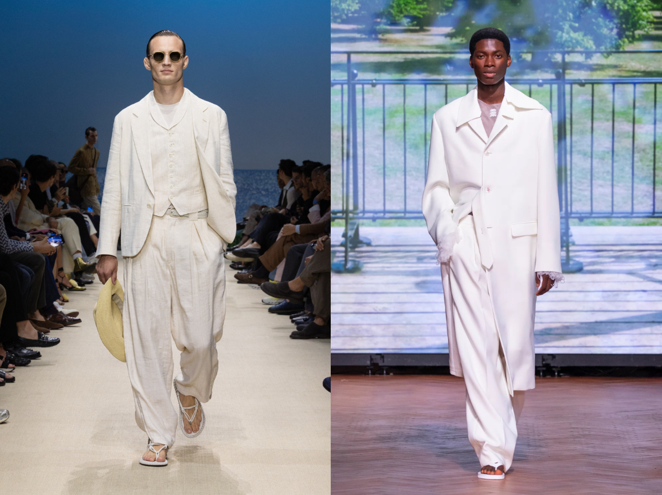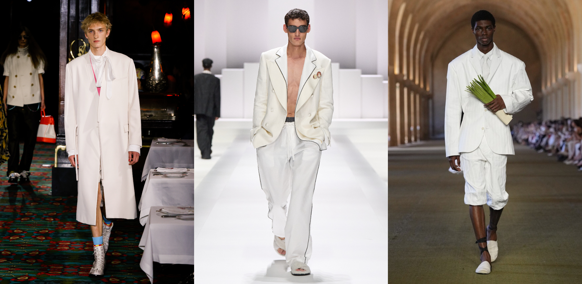 全白造型看似簡單,卻最考驗穿搭功力。以Cloud Dancer為核心,關鍵不在於色彩變化,而是材質層次與輪廓比例的精準拿捏──硬挺棉料、輕薄絲質、針織與皮革材質的交錯運用,能在單一色調中拉出豐富的視覺深度。2026春夏伸展台上,Kenzo透過領帶的加入,製造立體層次與焦點;Jacquemus則以明確的上寬下窄比例,讓白色造型展現結構張力。即便是Dolce & Gabbana那套由兩種不同白色組成的造型,也憑藉俐落的外套剪裁與柔軟下身布料的對比,使整體不流於平面,反而呈現出一種乾淨、成熟且極具質感的現代氣息。