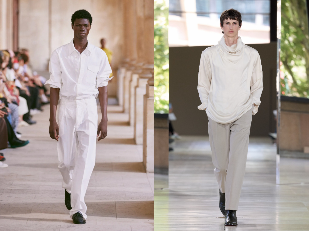 中性色調與Cloud Dancer能構成高度和諧的配搭,呈現出細膩、悅目且低調的色彩變化。它可以如Dior與Hermès般,自然融入米色、沙色、綠色、灰褐或淡卡其色之中,營造柔和而有層次的視覺節奏;也能像AWGE by A$AP Rocky與Egonlab那樣,與深藍或黑色並置,透過明暗對比為造型注入力量感。白色在其中不喧嘩,卻扮演著平衡角色,使整體色調最終沉澱於陰影層次之中,形成輕鬆而耐看的視覺對比。特別適合日常造型,在不刻意搶眼的前提下,依然保有清晰而成熟的風格輪廓。