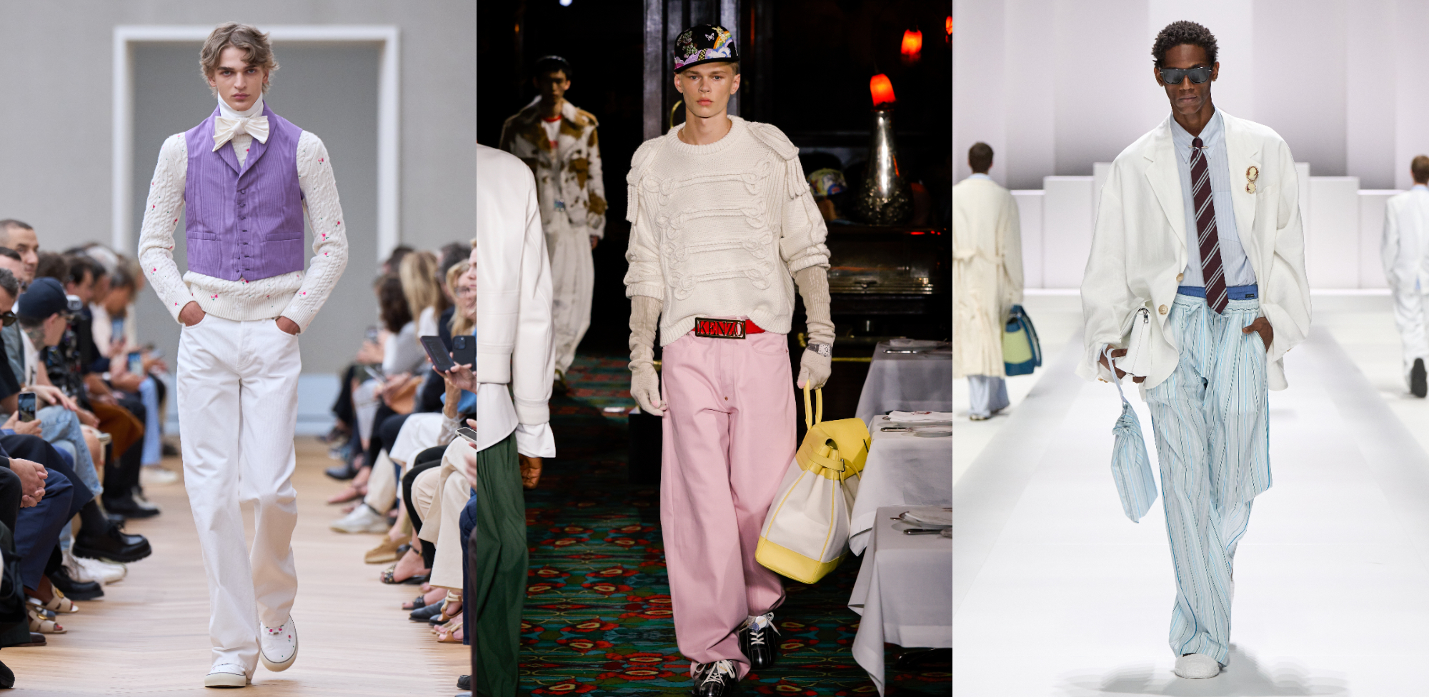 當Cloud Dancer遇上淡藍、霧粉、薄荷綠或淺薰衣草色,在白色的襯托下顯得更加通透、不甜膩,為造型注入溫和而現代的情緒層次。Dior以小面積的淺薰衣草色背心作為外層點綴,在純白造型中拉出柔軟而精緻的視覺焦點,使整體層次更顯份量;Kenzo則透過霧粉色寬褲與白色上身的搭配,利用低飽和色彩與白色之間的平衡,保留春夏的清爽感,同時讓輪廓線條更加洗鍊。至於Dolce & Gabbana,則將粉彩語彙延伸至整體造型之中,從西裝外套、襯衫、長褲到褲頭細節,甚至是領帶上的斜條紋,皆以柔和色調呼應Cloud Dancer,使粉彩不流於稚嫩,而是轉化為一種成熟而從容的風格表現。