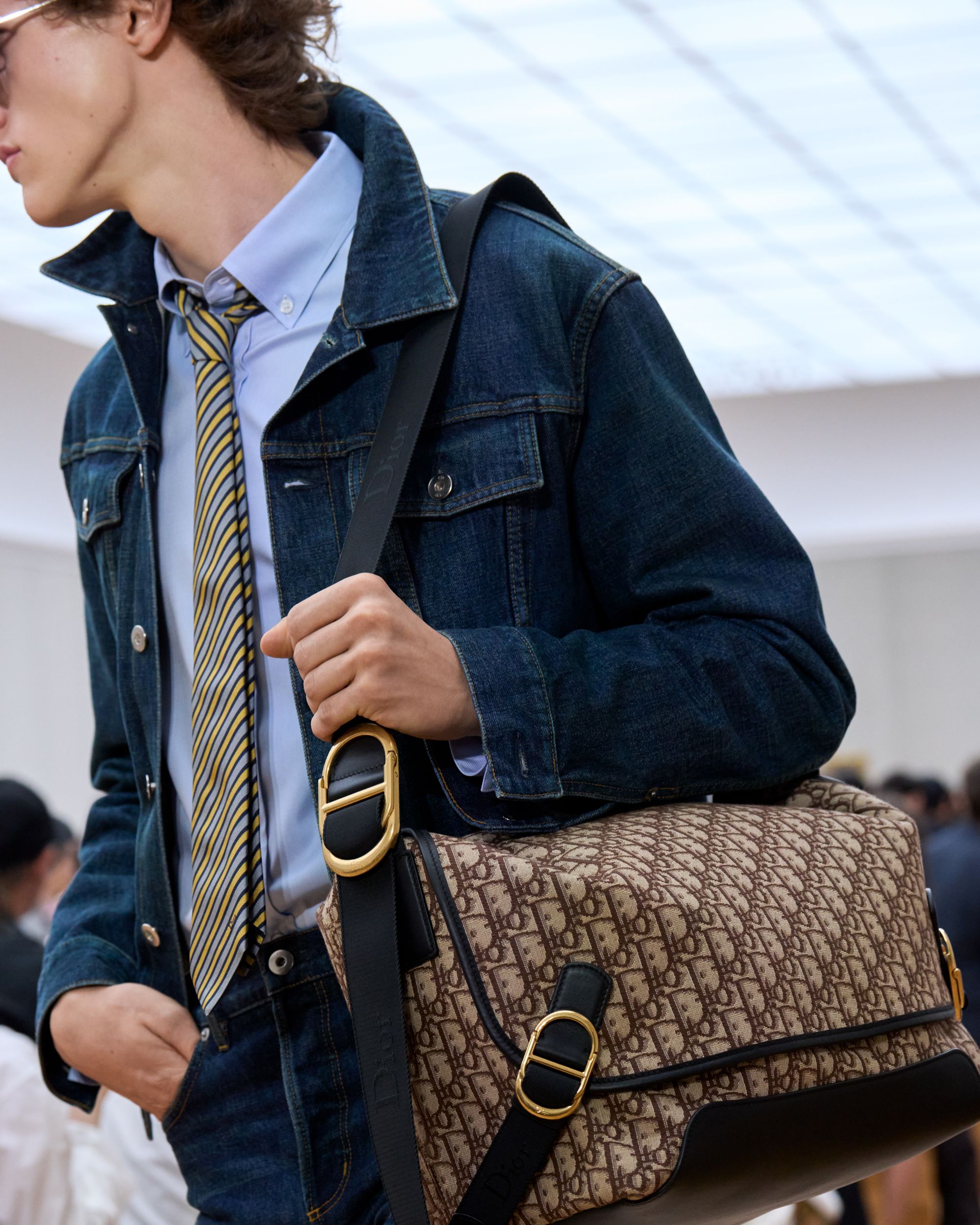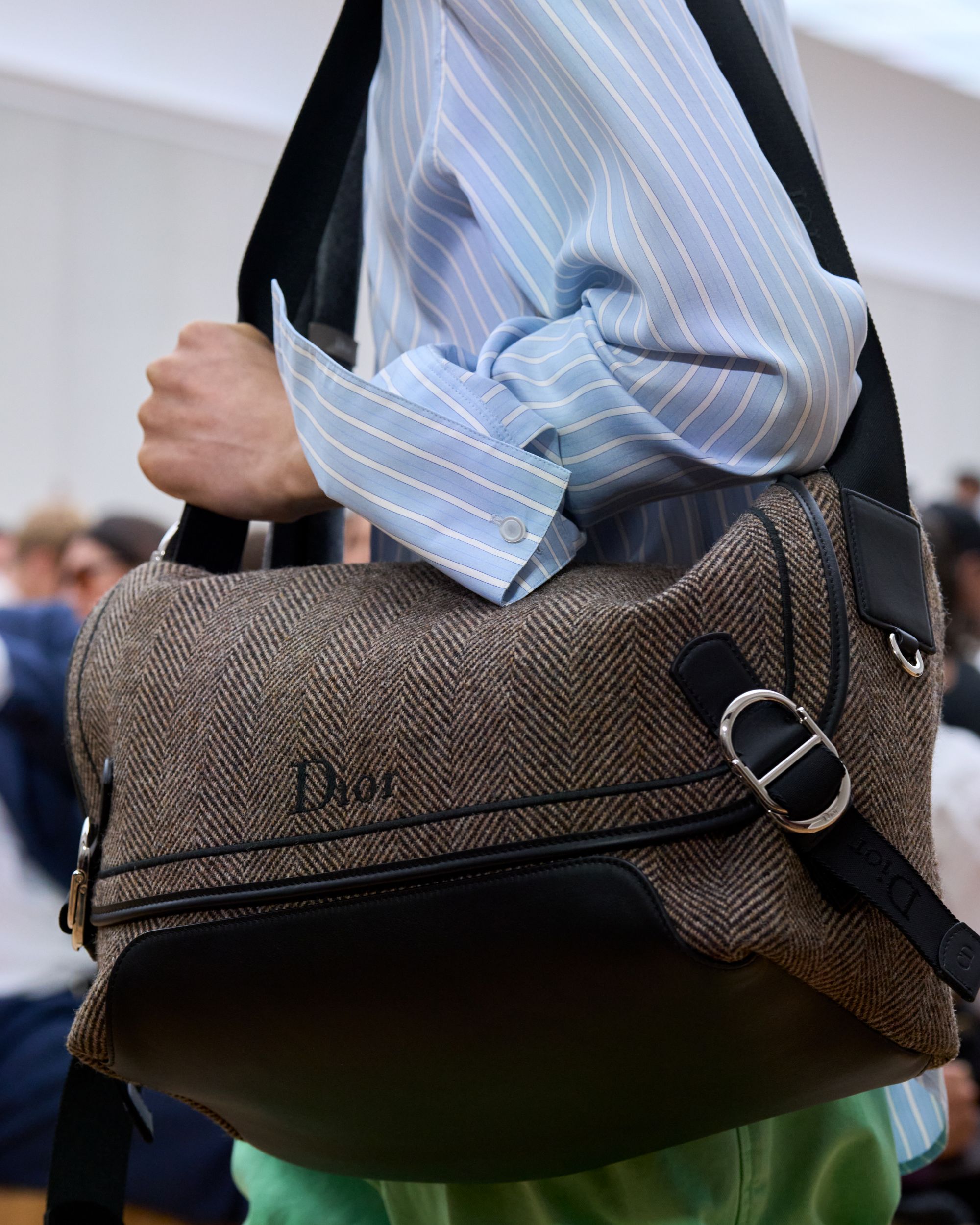 系列以Dior Oblique緹花帆布為核心,推出復古棕與黑色兩款色調。柔軟卻不失結構的輪廓使包身呈現剛柔並濟的姿態:沒有沉重的線條,也能穩住日常的實用性。這份分寸感,與現代男性在商務與休閒之間自由切換的狀態相呼應。