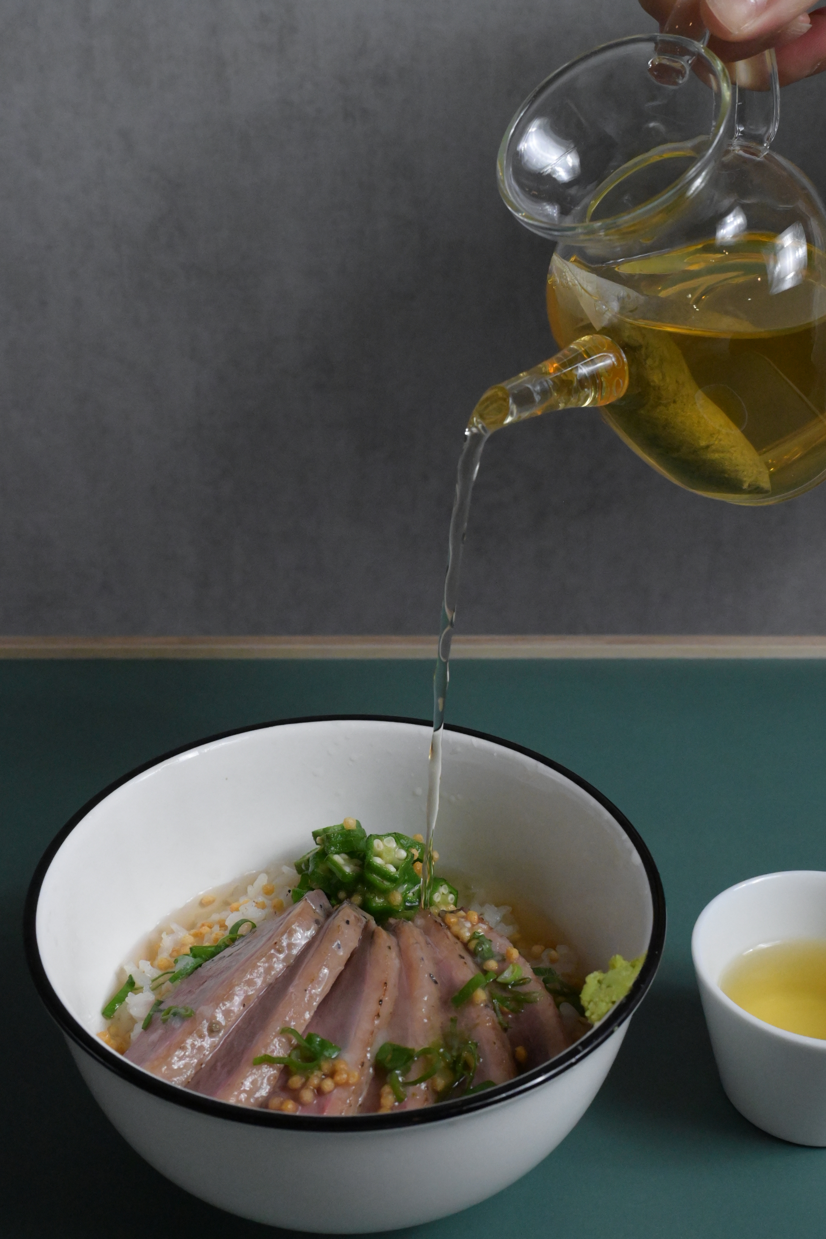 為了完整體驗茶泡飯的味覺層次變化,《茶與餐的實驗場》獨創「台灣茶泡飯三吃法」,不僅提升用餐儀式感,也讓風味層層疊加出不同變化。第一吃先品嚐日式主食搭配米飯的原始風味;第二吃將昆布柴魚雞高湯倒入其中,使湯頭層次呈現如日式雜炊般濃郁溫潤的風味;第三吃則先品茗一口七三茶堂精選的台灣風味熱茶,再加入高湯主食碗中,讓茶湯的單寧與香氣為濃郁的高湯與食材畫龍點睛,完成一場味覺的起承轉合。