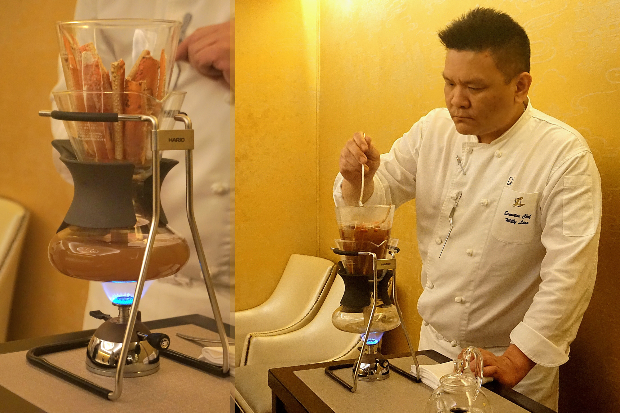 行政主廚廖偉立於桌邊演示虹吸萃取湯品。