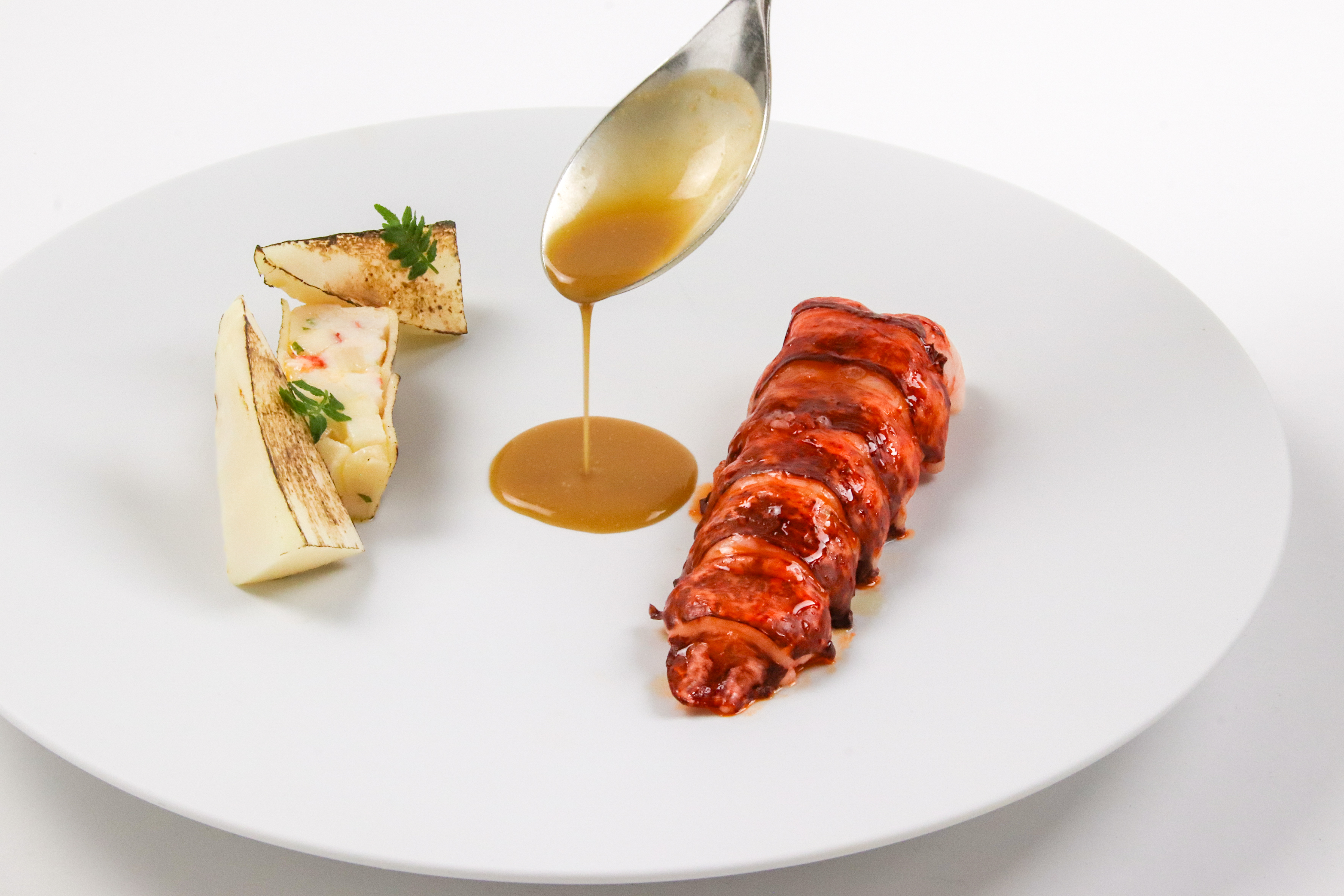 法國藍龍蝦則是以清蒸方式烹煮,但口感上十分令人印象深刻,不僅保留蝦肉最純粹的彈性,中心處一展現出柔嫩多汁的鮮甜口感,搭配山椒葉與綠竹筍製作的法式方旦(Fondant)佐以法式濃縮蝦醬,龍蝦的鮮香與綠竹筍的脆甜口感交織,山海的甘美風情與口中構築出華美的風味詩篇。