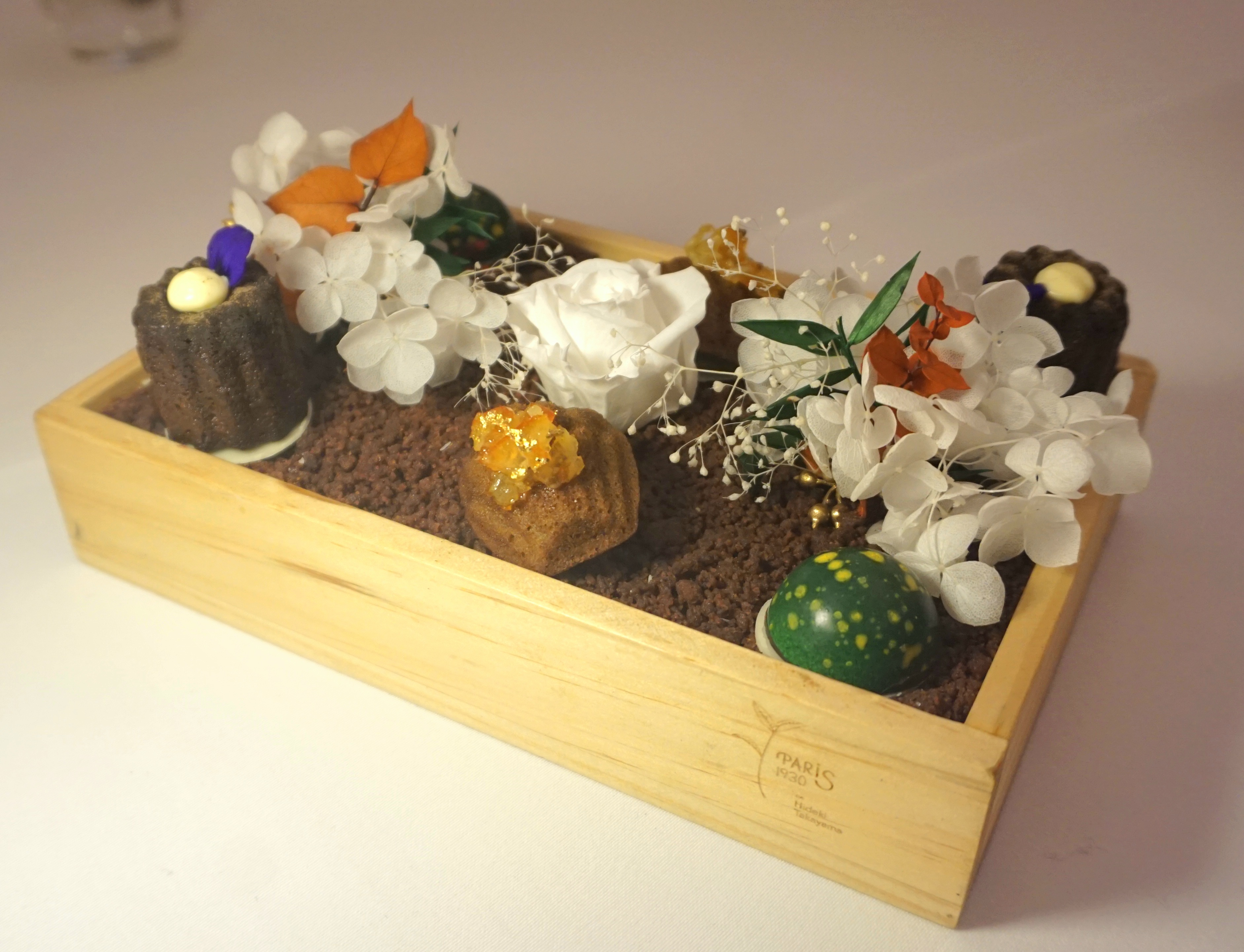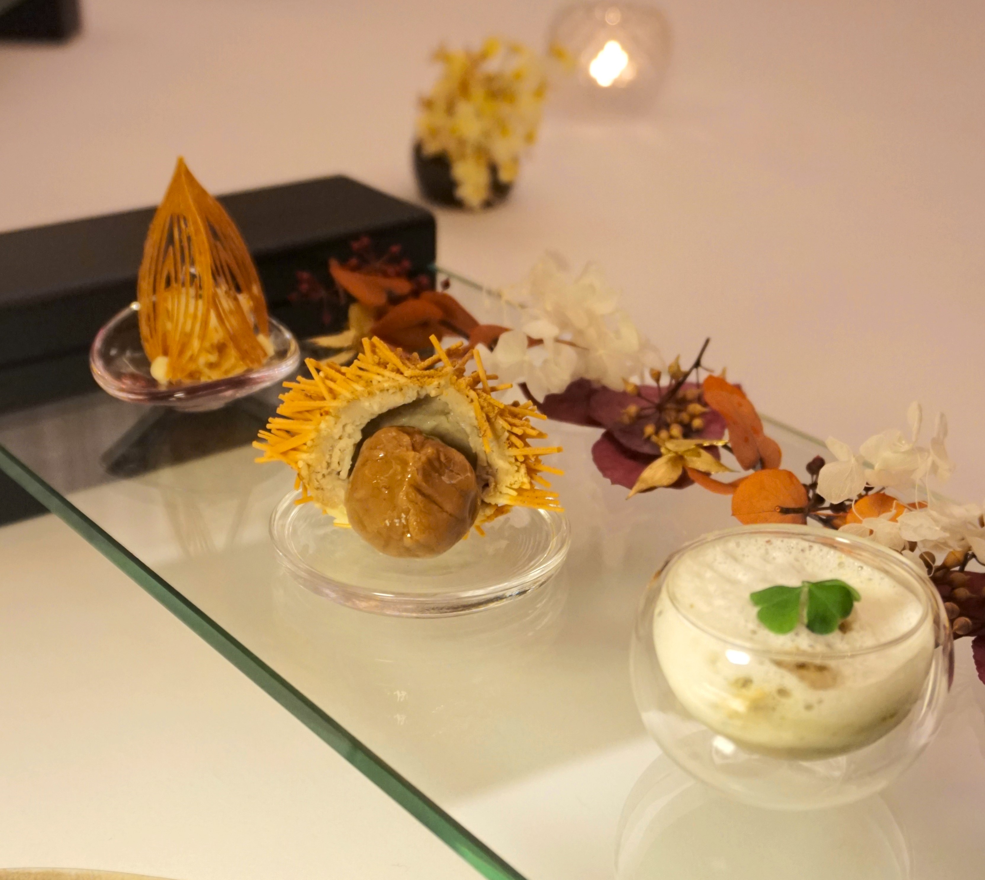 套餐開場的主廚歡迎小點,分別以「牡蠣‧耶路撒冷朝鮮薊濃湯」、「栗子球」與「洋蔥巴伐露亞」,以橫跨山海的風味揭開餐會序幕,小點中最讓人印象深刻的是栗子球,將內餡以洋蔥、西芹翻炒後融入風乾火腿,再以栗子泥包裹,外殼以雞肉慕斯、馬鈴薯泥與栗子泥塑形,裹上油炸的日本素麵形成栗子的殼狀外貌,看似新鮮剖開的甘栗,風味常來卻是鹹香息佔據口中、再搭上些許的栗香甘甜,從視覺到味覺皆有著顛覆認知的趣味。