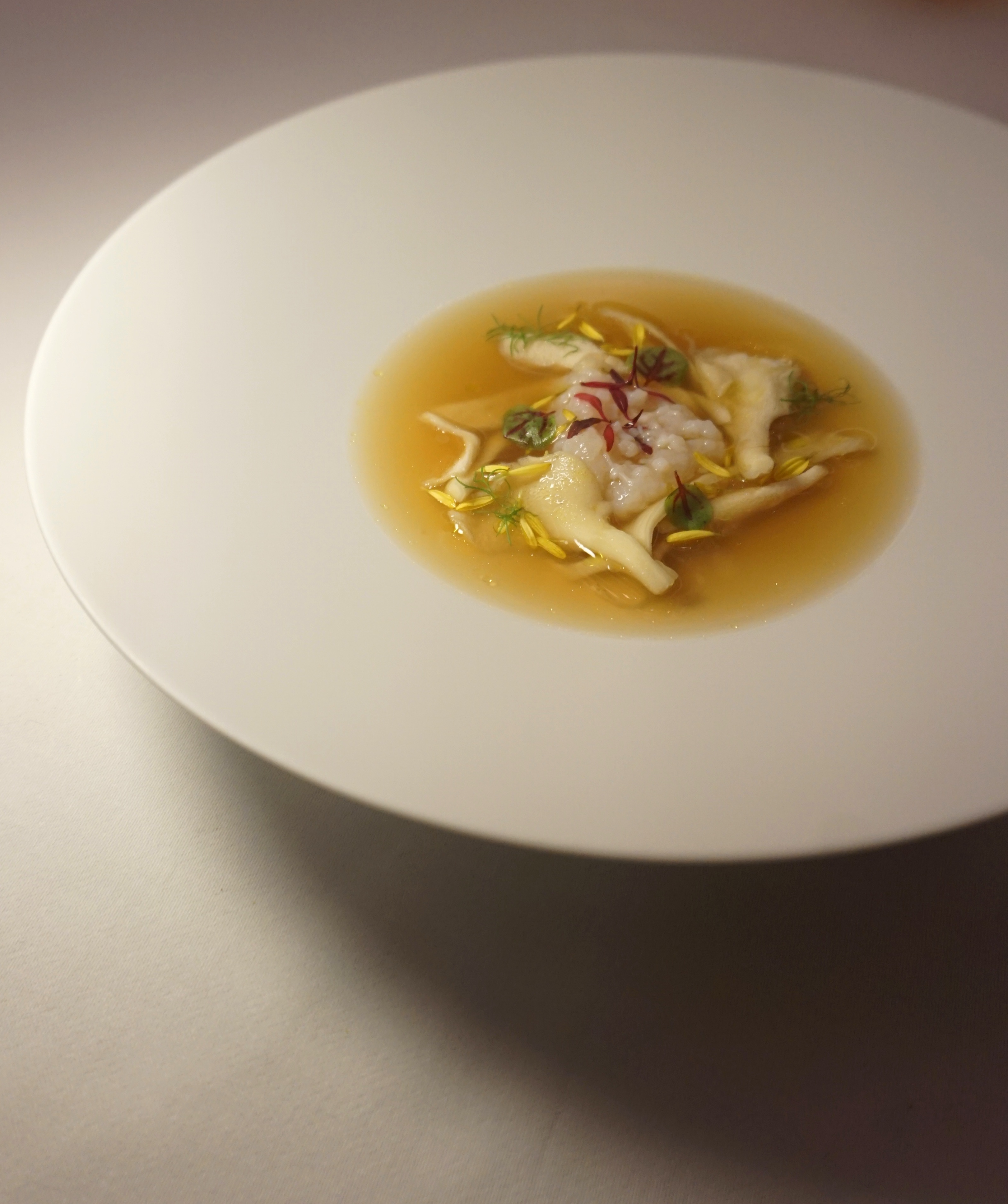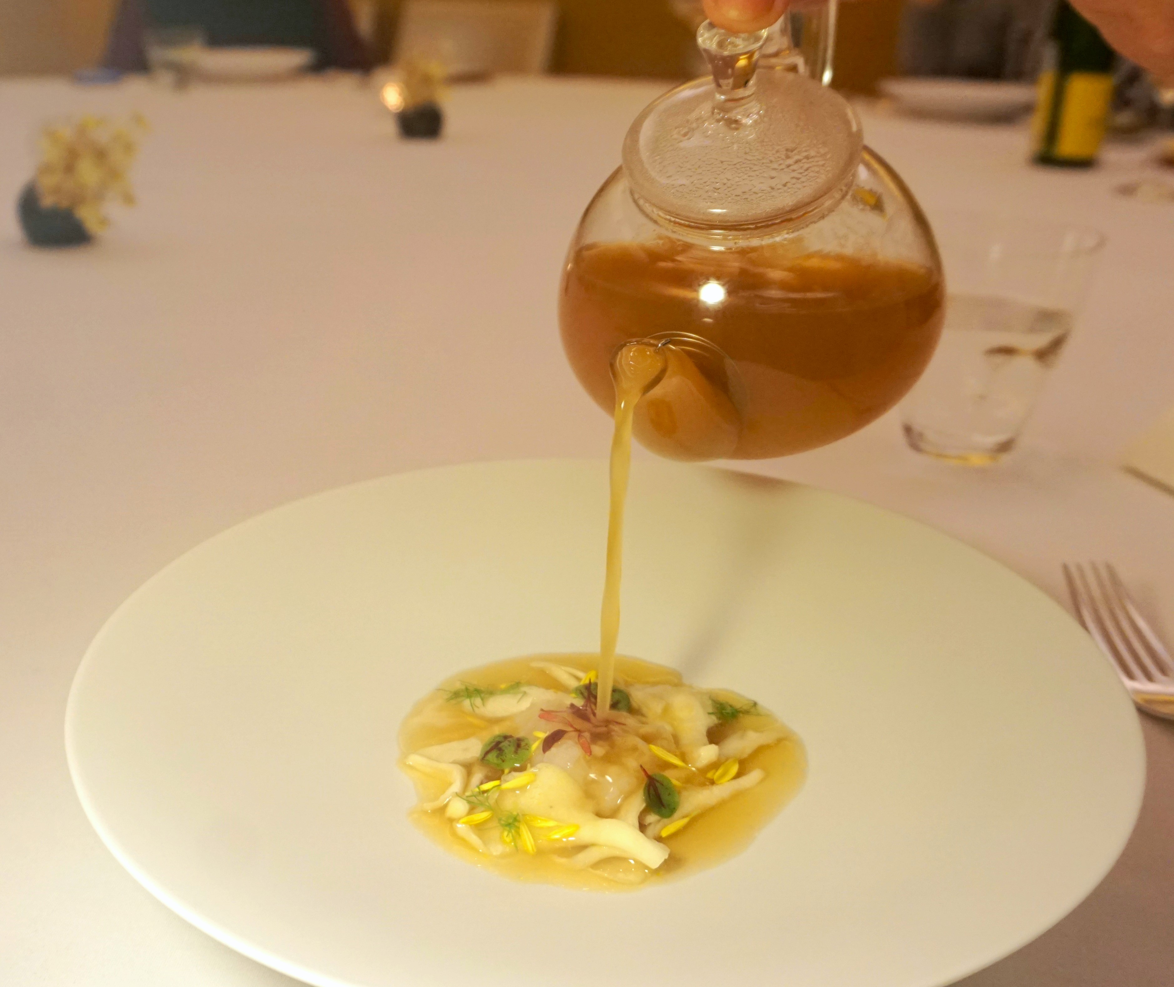 本季菜色的一大亮點同樣也在於對海鮮的詮釋,「蟹 舞菇 漢方魚湯」,是廚藝總監高山英紀於台灣旅行時的靈感新作,魚骨、昆布、松葉蟹殼、大蔥蔥綠、薑及大量清酒熬出鮮美魚湯,上桌前在桌邊以虹吸萃取的方式將高湯與烘烤後的蟹殼及當歸、黃耆、枸杞、紅棗等中藥材相互融合,藉由短時間的萃取,讓湯頭具有中藥的香氣,同時又能避免其浸泡過久產生苦味。