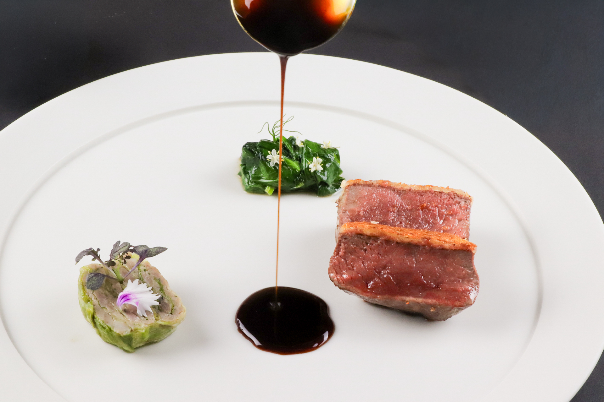 紐西蘭鹿肉則選用鹿肉紐約客部位,以精準火候烤至三分熟,肉質細嫩、野味清朗。表面覆以杜松子酥皮,帶出森林般的辛香與清新氣息。配菜以法式傳統高麗菜捲呈現,搭配緹魚奶油風味的大豆苗,使整體更添柔滑與草本亮度,並佐以馬告香氣收尾的鹿肉醬汁,融合辛香料與山林氣息,味覺層次清新且平衡,呈現細膩的冬季野味風景。