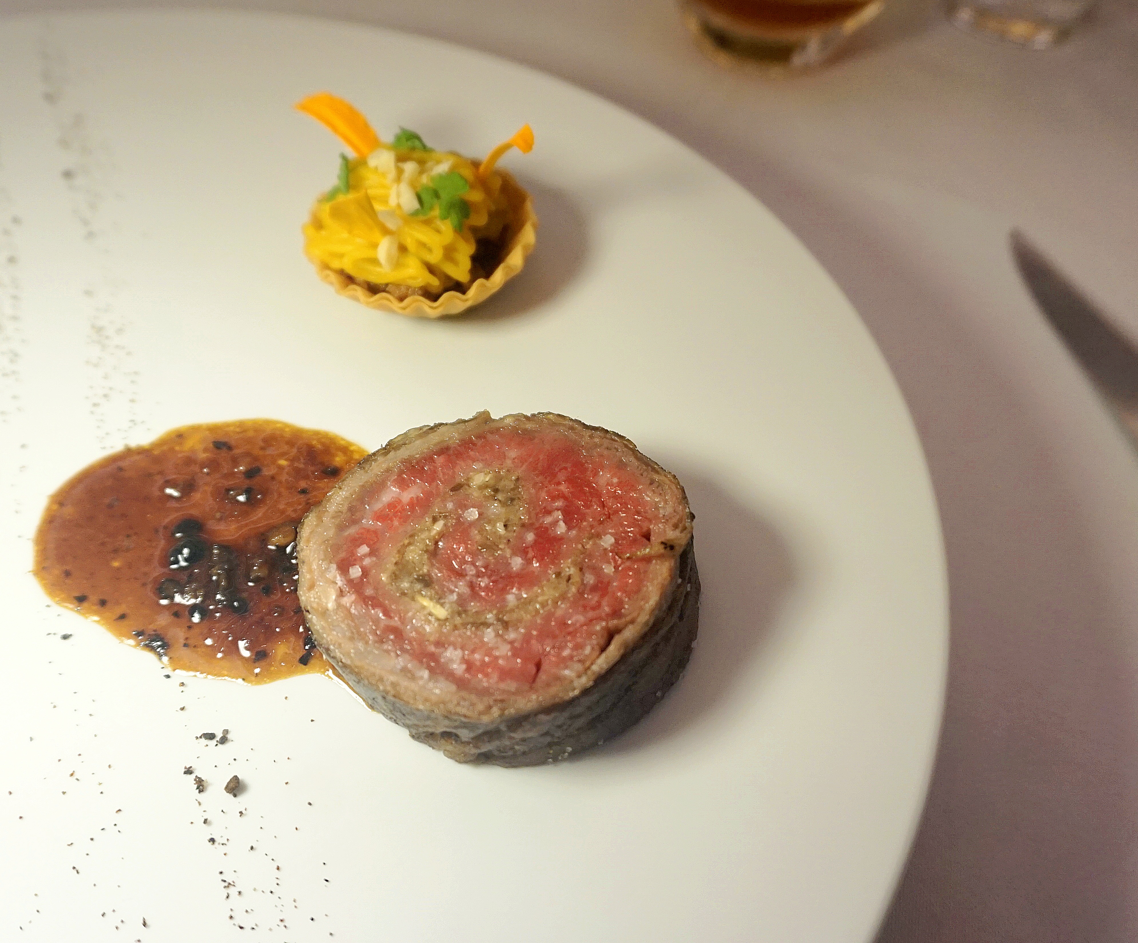 冬季套餐的主菜則依各菜單不同,有日本A5和牛、法國藍龍蝦、紐西蘭鹿肉等橫越山海的豐富選項。日本A5和牛以肉捲的方式呈現,將牛肉切成均一厚度後,鋪上以雞肉慕斯、洋菇與松子製成的內餡,捲成柱狀定型包覆,再以低溫烹調後輕煎上色,呈現近似三分熟的細緻質感。品嘗時不僅能感受到牛肉本身的柔嫩多汁,肉卷內餡散發著堅果清香與蕈菇的深邃香氣,更讓整體口感在木質氣息的襯托下使餘韻更為豐沛、令人回味無窮。