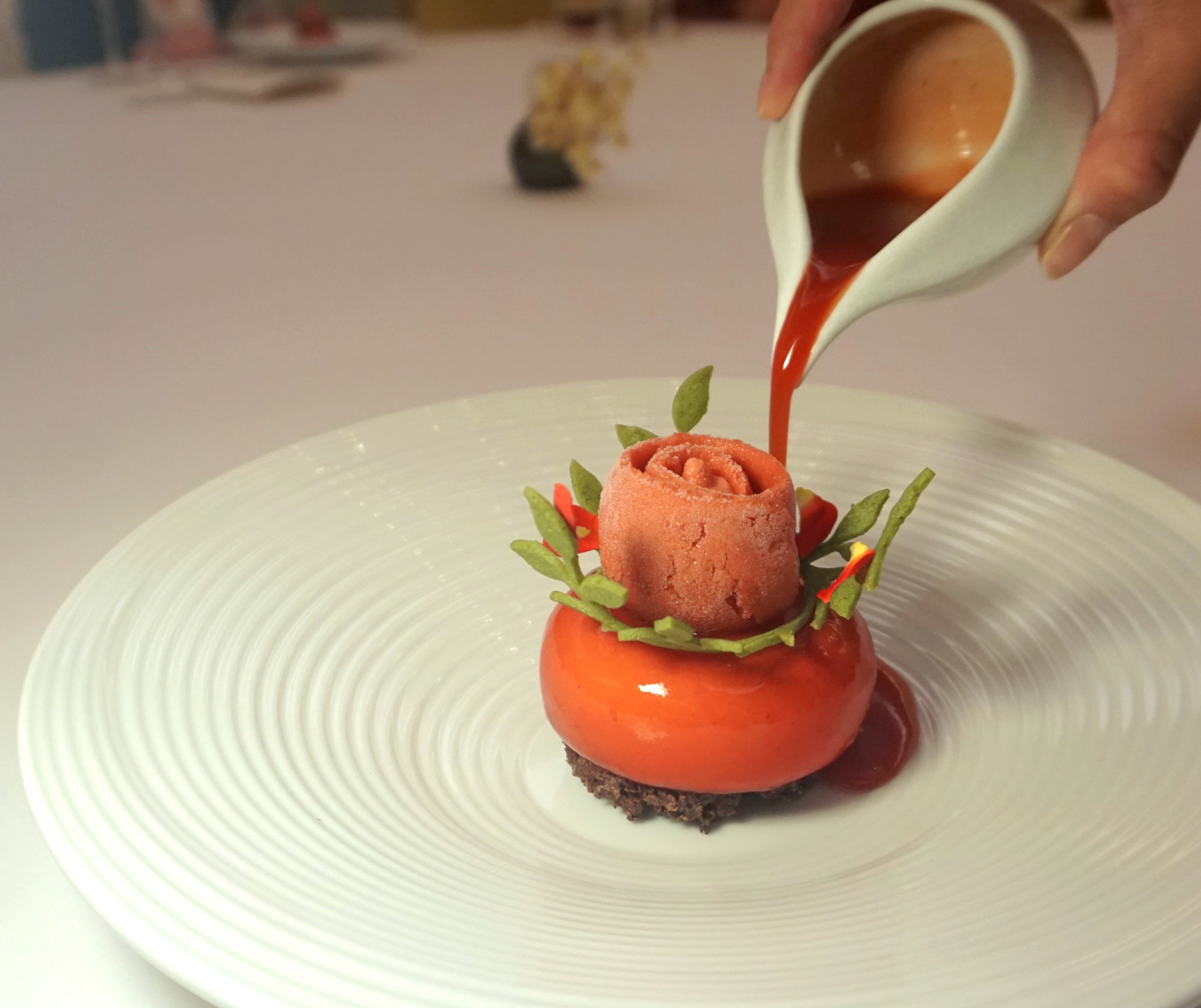 冬季時分最受歡迎的水果,莫過於色澤粉嫩的酸甜草莓,本季巴黎廳冬季套餐的限定甜點便以草莓為主角創造出「草莓三重奏」以巴芮脆片為基底,結合法芙娜70%與85%巧克力的濃郁苦韻,頂部覆以草莓慕絲與草莓利口酒,帶出清爽果香,搭配自製草莓雪酪、85%巧克力香緹與法國香榭蜂蜜、草莓丁。最後淋上以低溫長時舒肥手法萃取新鮮草莓成為的草莓清湯,並點綴上碧螺春茶蕾絲餅,視覺滿分的粉色甜點堪稱夢幻之選,若是帶愛侶來約會選擇此道甜點,絕對能為餐敘帶來氛圍滿點的浪漫收尾。