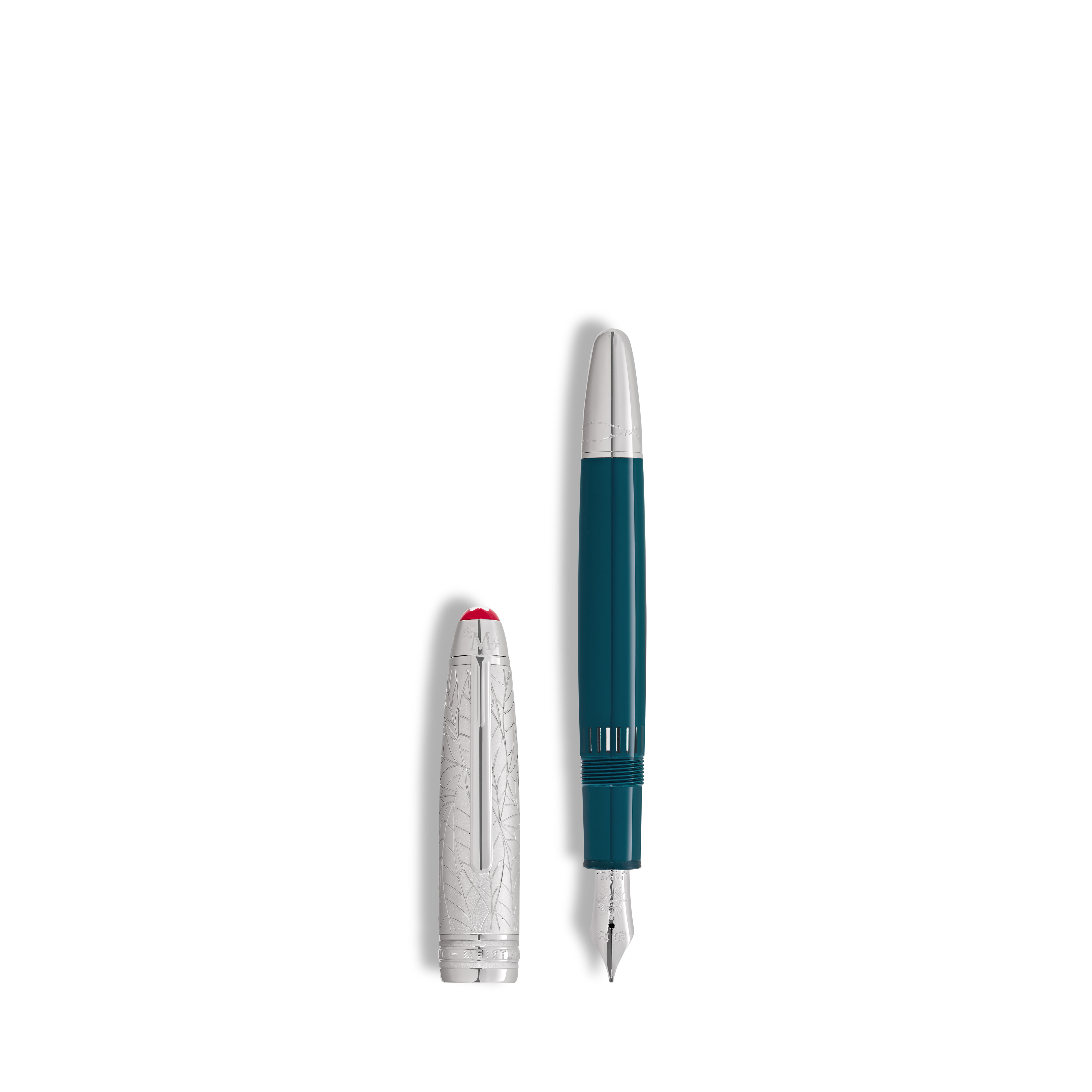此筆款揉合羅密歐與茱麗葉筆款於同一設計之中,象徵著兩個世界結合為一。筆蓋與筆身採用藍綠色漸變亮漆打造,點綴著飾有標誌性鍍金輪廓的葉片圖案,讓人聯想到凱普萊特果園的綠意盎然。筆蓋頂端的白色品牌標誌鑲嵌於對比鮮明的紅色邊框中,字母「C」與「M」相互交織,象徵著兩個家族之間的宿怨,也預示著這對戀人的命運;筆蓋頂端與筆尾的荊棘裝飾,也體現了他們悲劇的命運。Au 750純金筆尖飾有「R+J」字樣,以此頌揚他們超越衝突、永恆不朽的愛情關係;另有鋼珠筆、原子筆可供選擇。