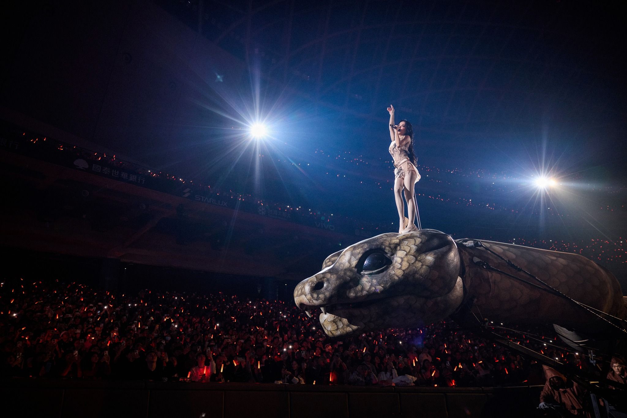 HS:我的天,絕對是〈紅衣女孩〉!我超愛這首歌,但最讓我難忘的絕對是那個巨蛇開場(笑)!看到巨蛇緩緩移動,全場尖叫的瞬間,是我生涯最難忘的登場方式之一。