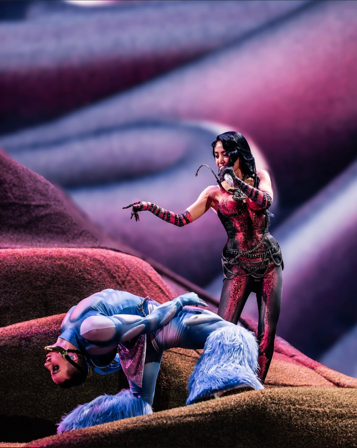 HS:其實我們不把它當舞台,我們把它當成一個「超現實主題樂園」,Jolin 給了我們很棒的願景,所以我們設計了 12 個巨大道具。不只是擺在那,它們會跟著故事「變身」。當她們互動時,那些道具就像是有生命的演員。