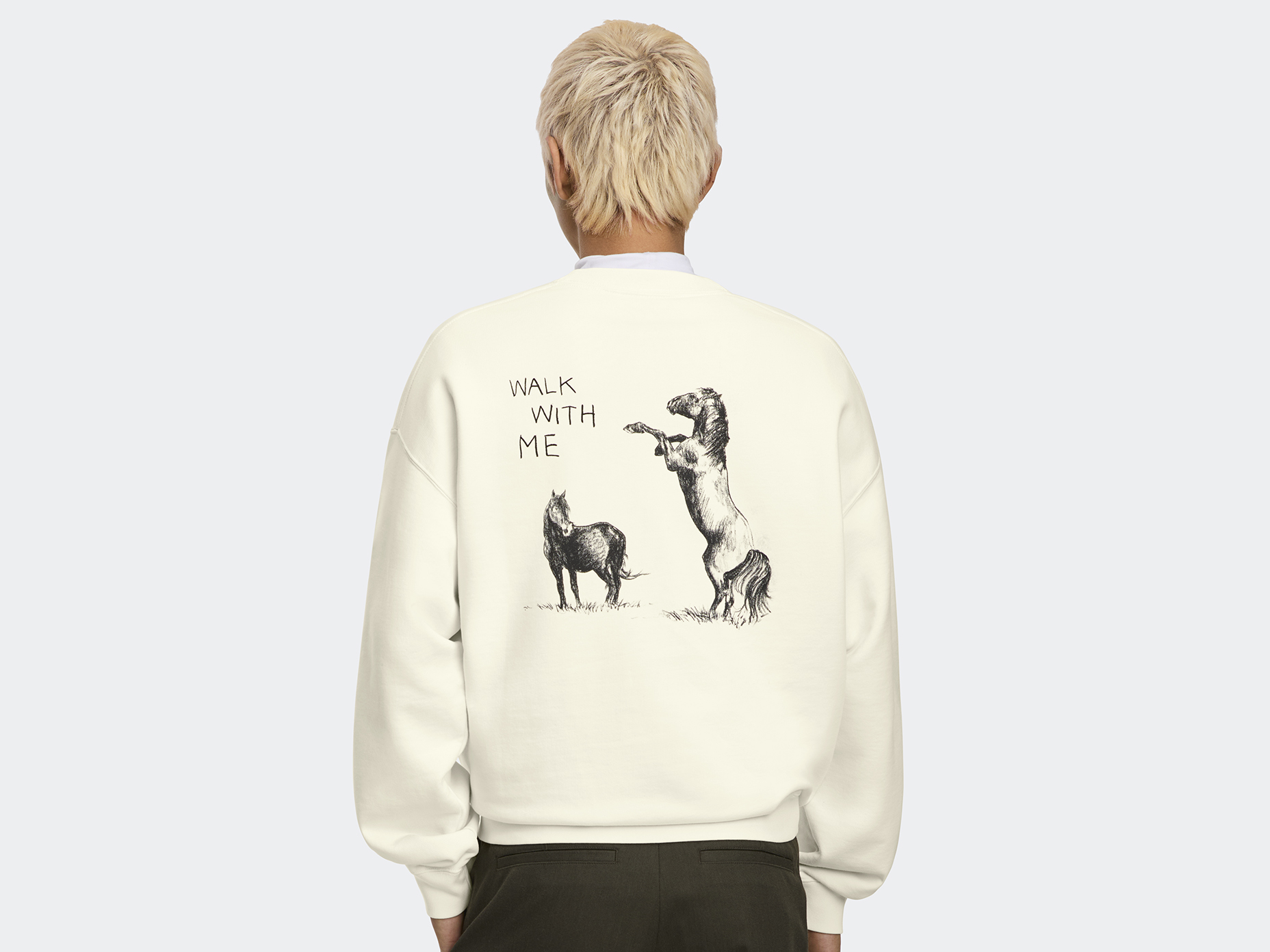系列單品包括Rove Crew長袖 T-Shirt 採用有機棉毛巾布精製而成,觸感細膩沉穩、表面平滑雅致,雙線縫製保持俐落版型;搭配細膩手繪筆觸描繪馬匹的動態,一匹佇立、一匹躍起,形成流動的視覺節奏。「WALK WITH ME」標語點題,傳遞並肩前行、探索未知的精神,讓單品在簡約之中蘊含藝術故事性。