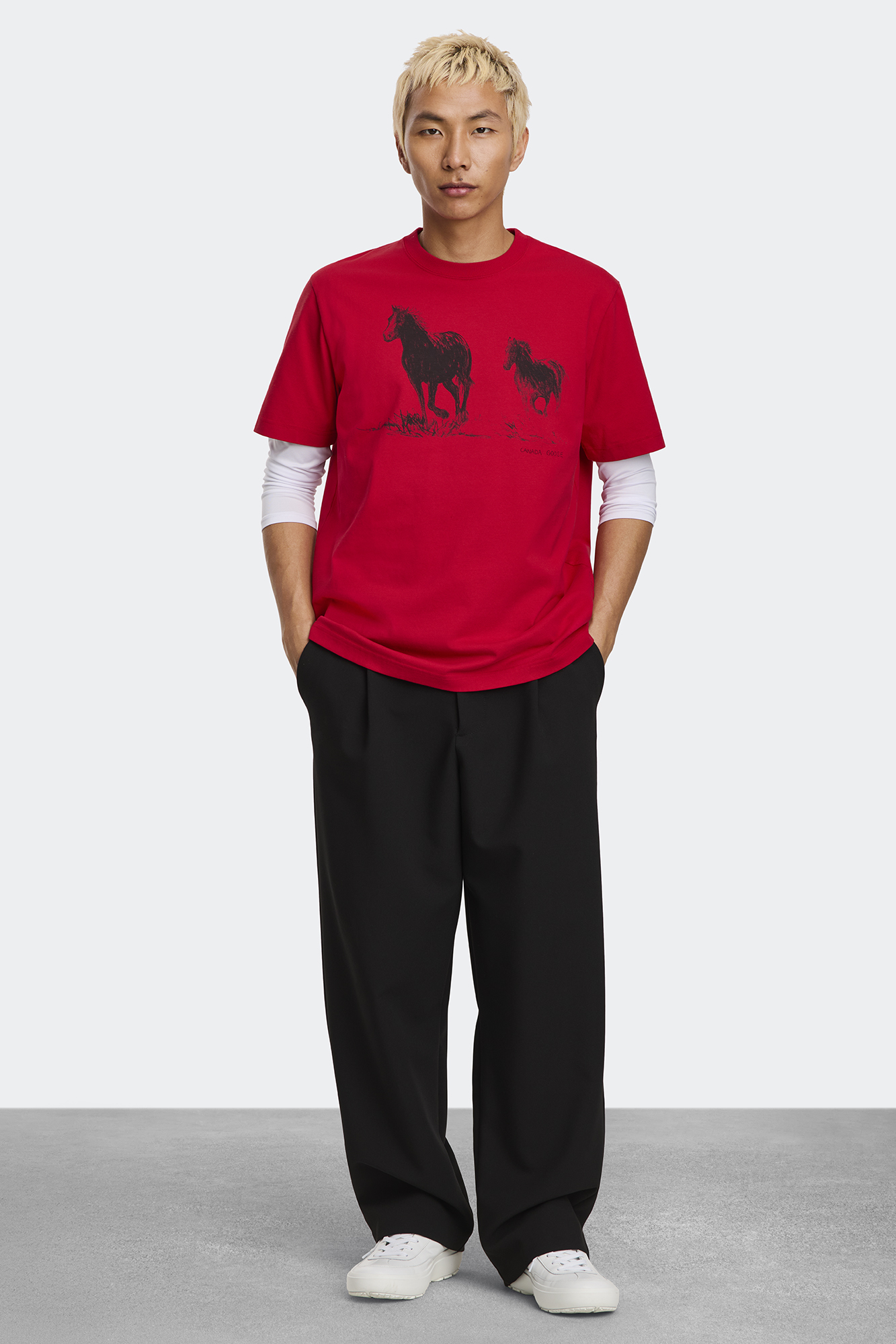 Vantage 短 T-Shirt 則選用中磅數有機棉針織布料,兼具紮實結構與細緻柔滑的親膚觸感。簡約俐落的剪裁,勾勒出自然優雅與當代時尚並存的輪廓。圖騰以細膩素描筆觸描繪馬匹行進於荒野之中,一前一後的構圖展現節奏與默契,寓意在歲序更迭之際、以穩健步伐開啟嶄新一年的前行力量;配色推出米白色、及象徵新春祝福的胭脂紅色,為年節穿搭注入從容而有力的風格態度。
