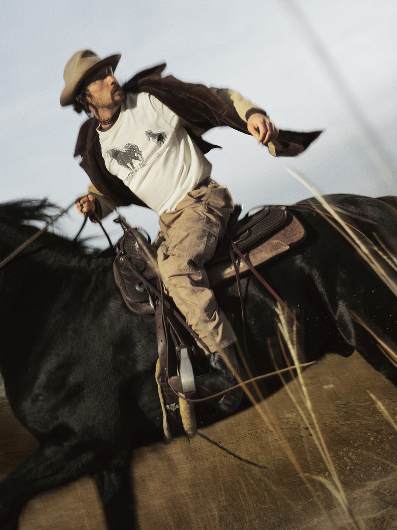 Matt McCormick分享道此次與Canada Goose的聯名創作,靈感源於野馬神秘奔行的存在感,以及其在紀念碑谷與馬匹共度旅程的時光。整體視覺聚焦策馬馳騁的動態瞬間,奔行節奏與自由姿態交織出強烈存在感。