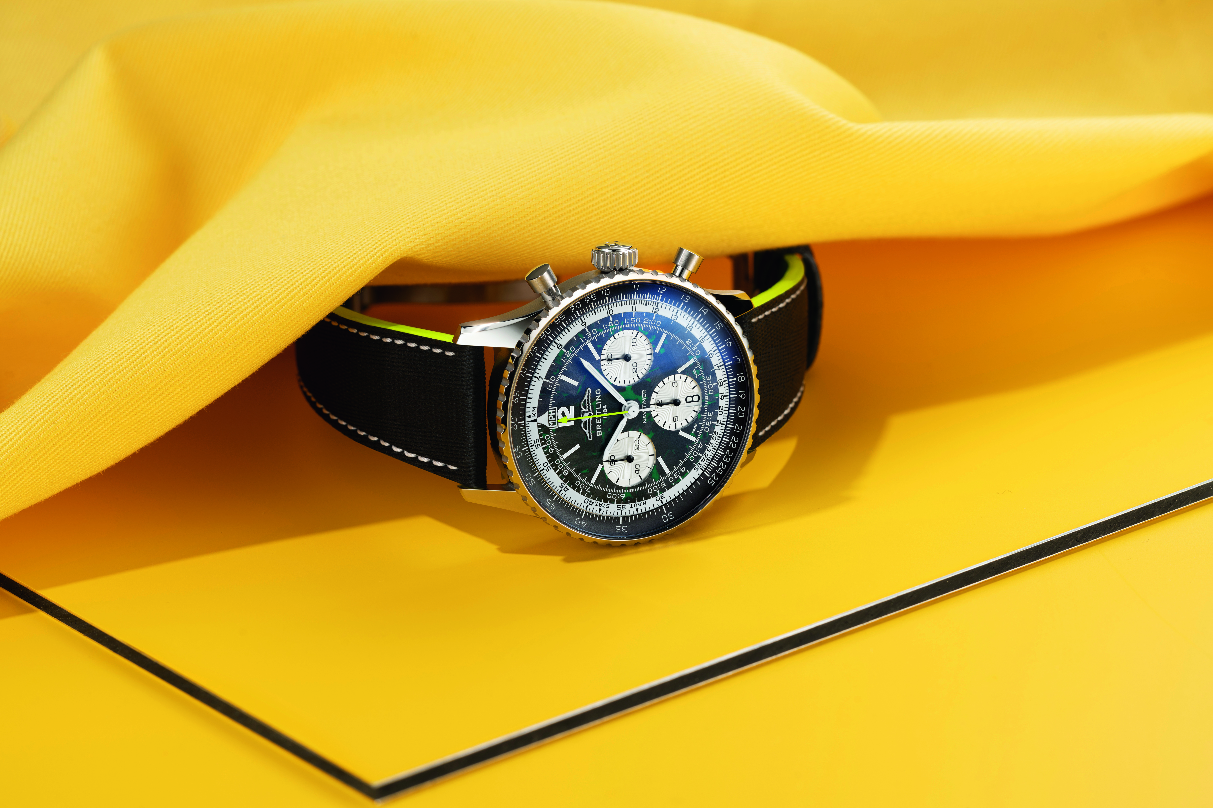 Navitimer B01 Chronograph 43 Aston Martin Aramco Formula One Team計時腕錶讓Breitling這款經典計時傑作正式回歸賽車世界。限量1,959枚,致敬Aston Martin於1959年踏上Formula 1®賽道的歷史性時刻。每一項設計細節,皆以性能為核心語言展開:Aston Martin賽車綠與清檸色調,取材自Aston Martin Aramco賽車塗裝;輕量化鈦金屬錶殼首次應用於Navitimer系列;碳纖維錶盤則直接呼應F1賽車駕駛艙的關鍵材質。皮革錶帶的設計靈感源自賽車安全帶,而強化夜視顯示,則確保在任何競速環境下,皆能清晰判讀時間。