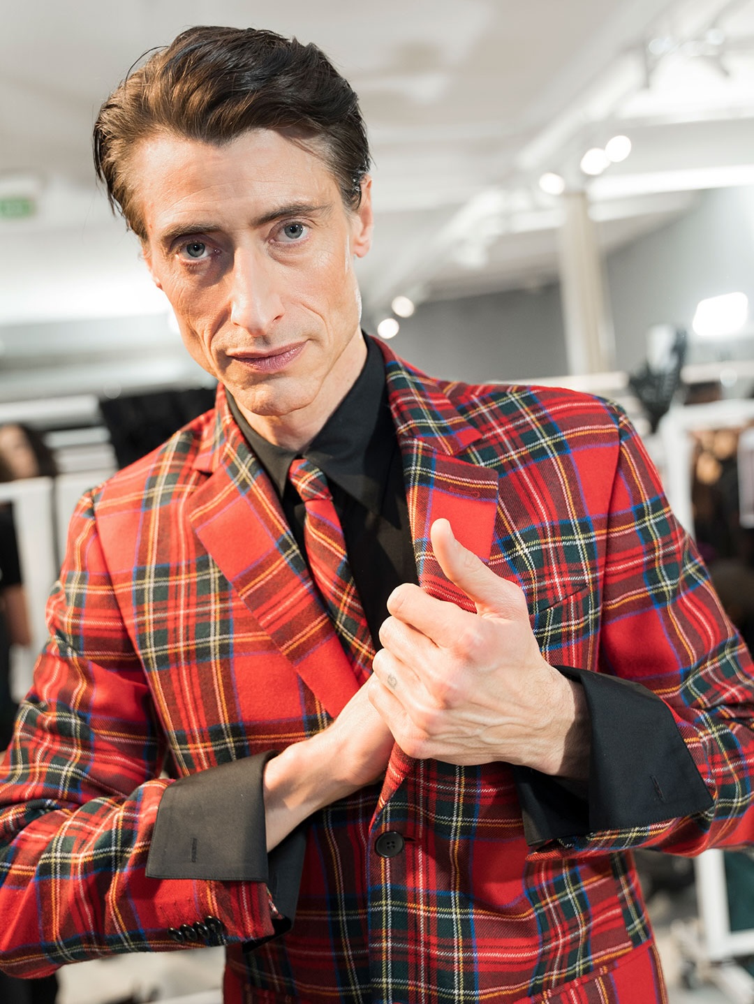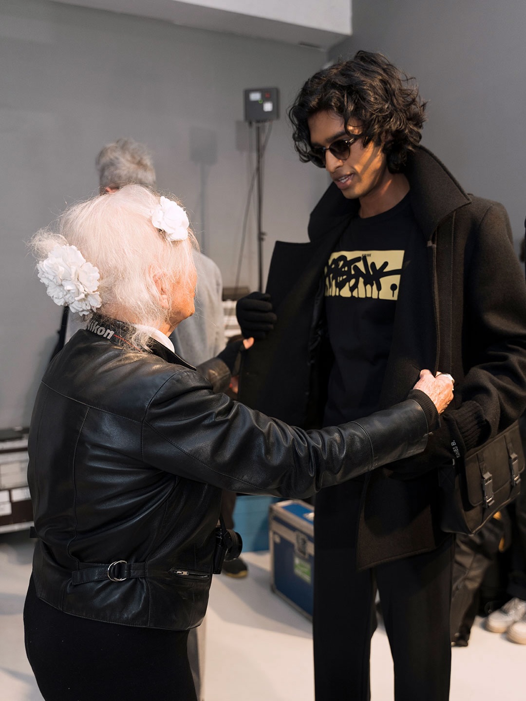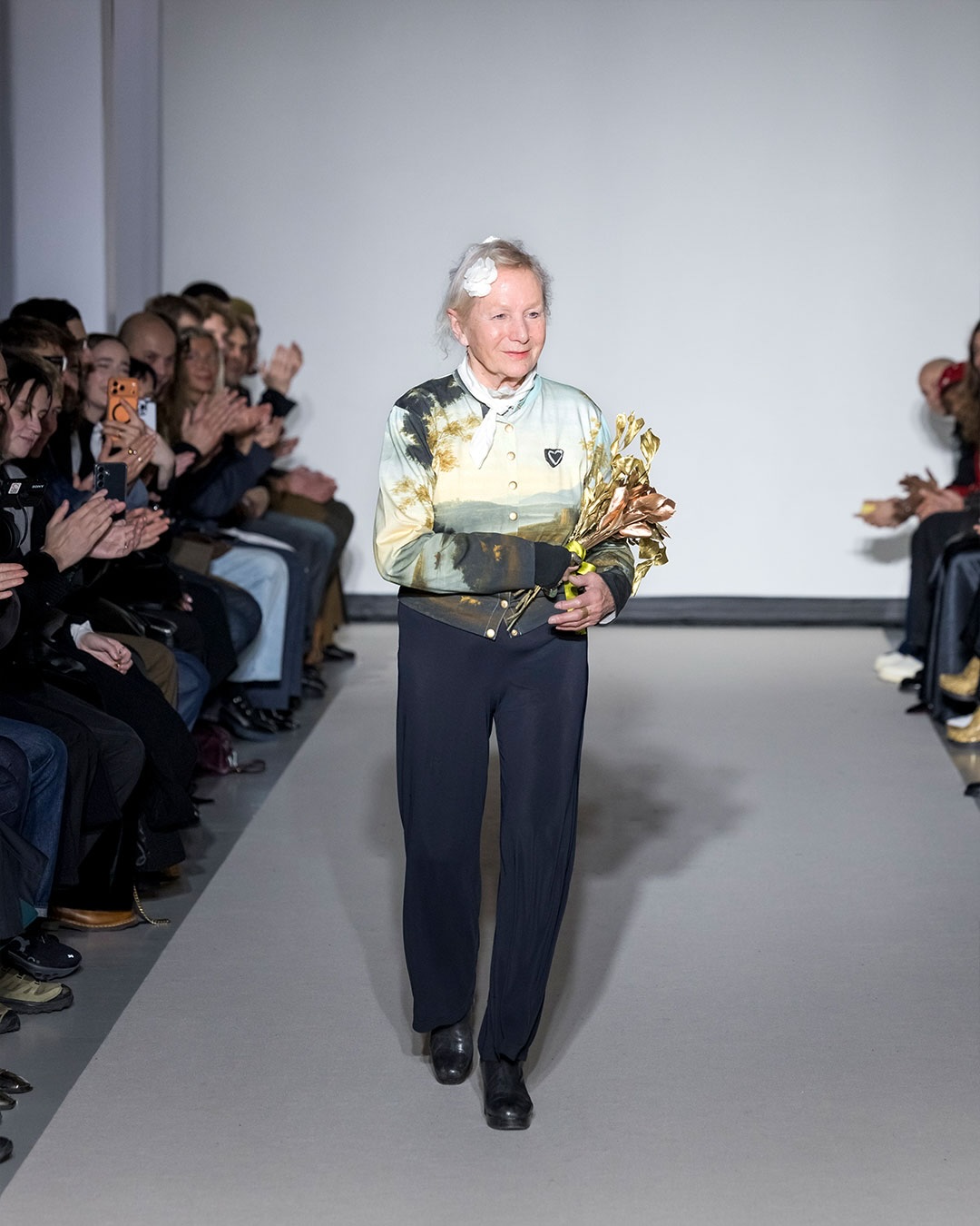 取自 Agnès 女士攝影作品的 Photoprints 印花、帶搖滾氣息的紅色格紋與復古彩色條紋,像她隨手翻開的私人相簿,處處都是她的身影。光澤天鵝絨與柔軟喀什米爾並置,皮革與針織毛呢共存,這些對比不是為了製造張力,而是因為真實的生活本來就是這樣疊加的。