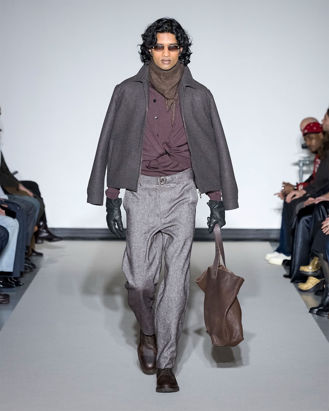 2026 秋冬系列依然是那個熟悉的世界,俐落中長版大衣、結構性毛衣、寬鬆而比例準確的褲款,全身丹寧搭配簡單休閒皮鞋。巴黎冬日的灰色街景滲進色彩基調,酒紅與棕色帶來剛好的溫度。