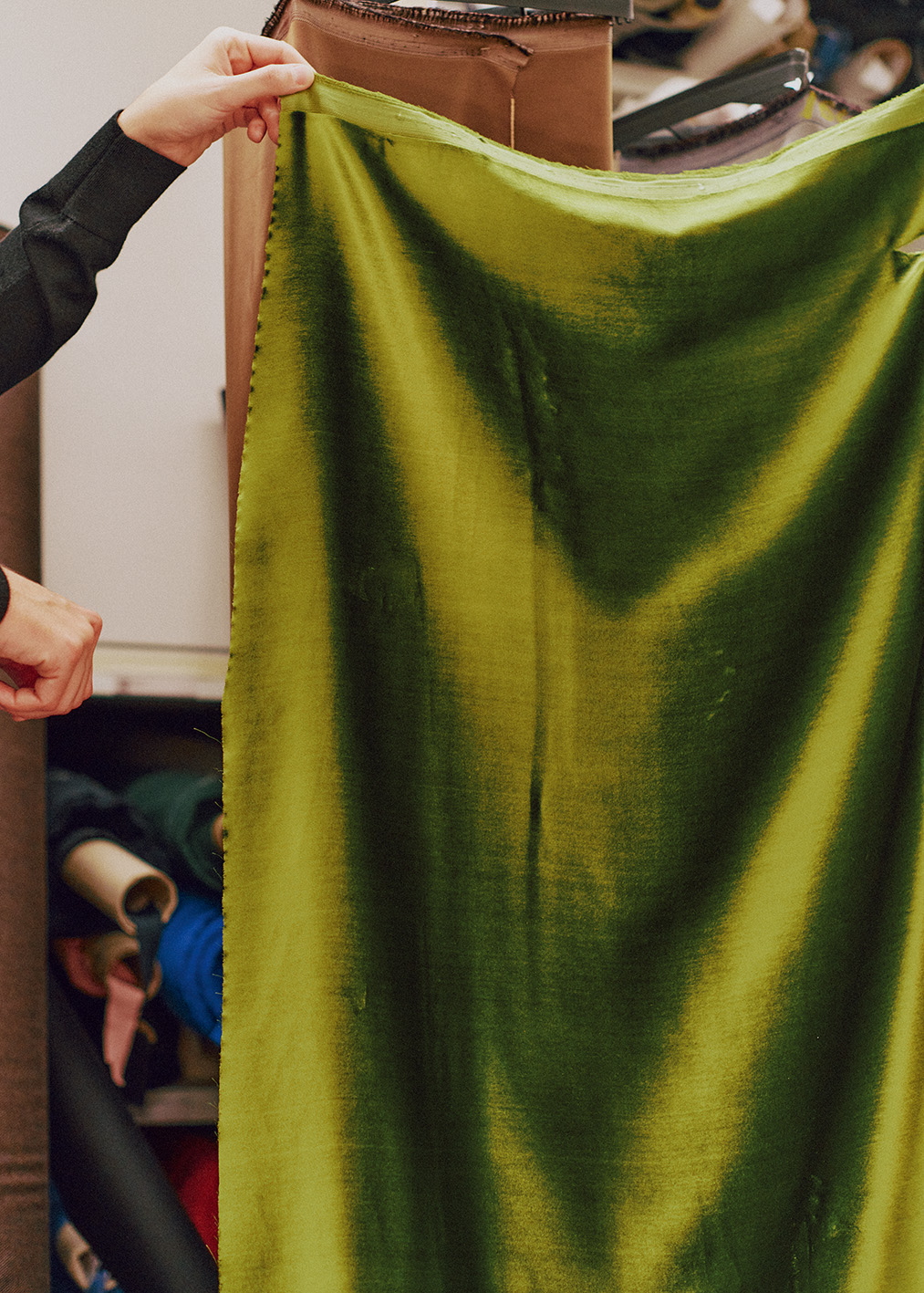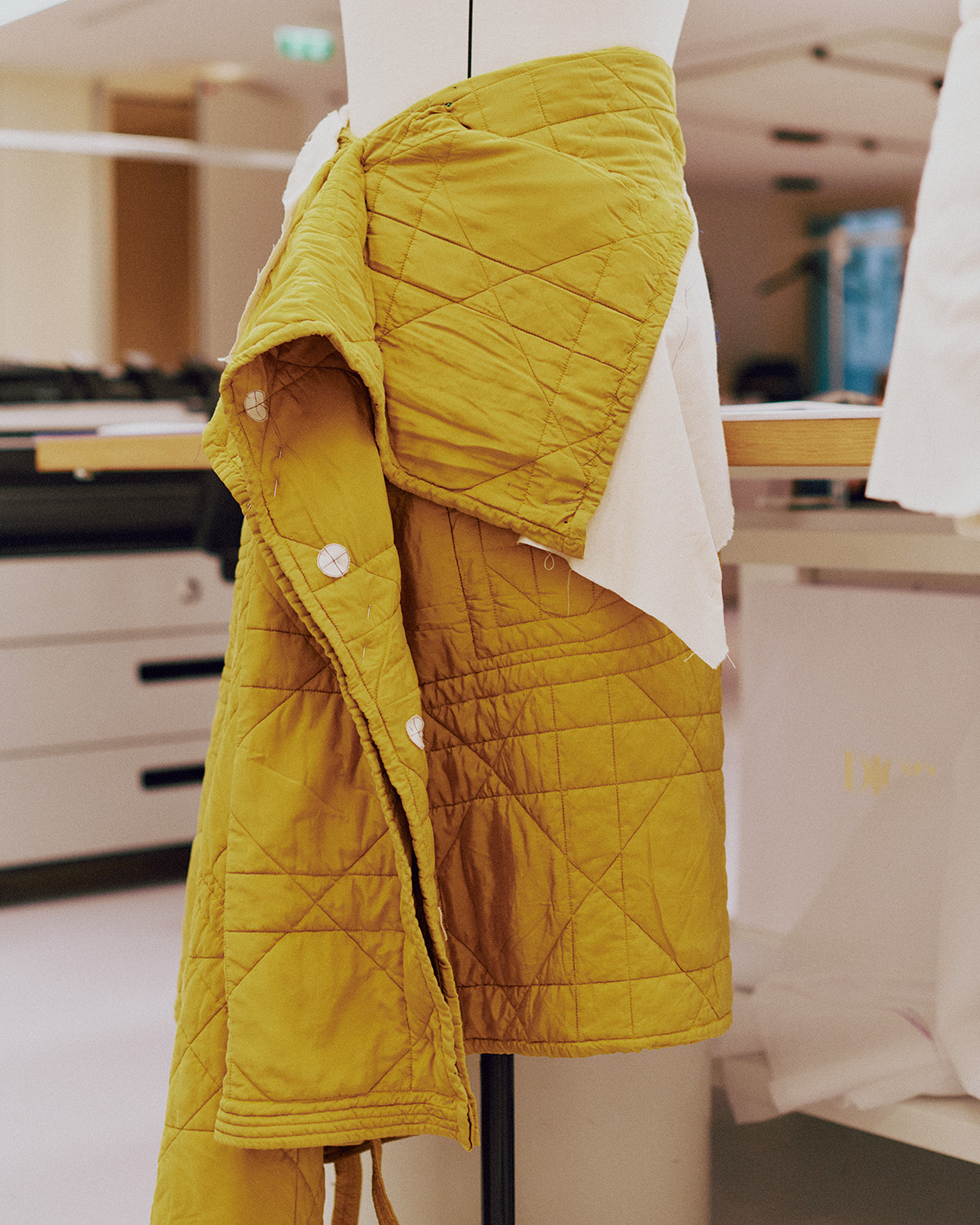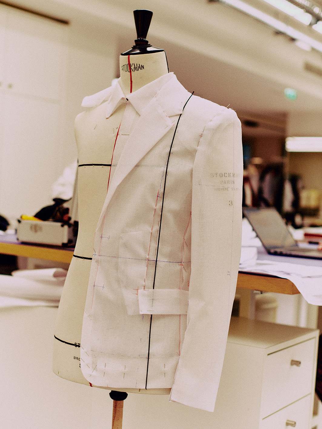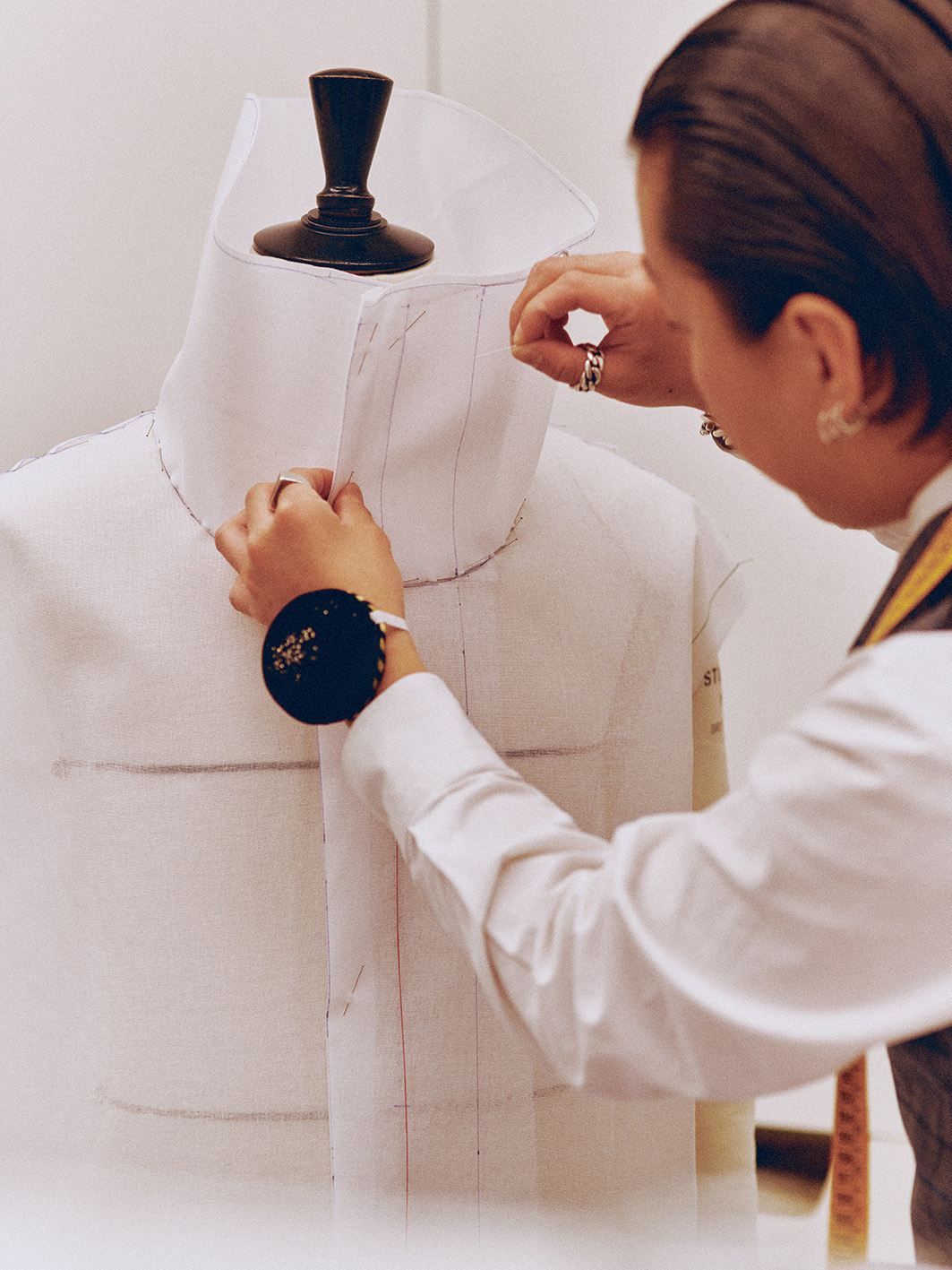 走進成衣工坊後,處處充滿細節,會讓人立刻明白「奢華」究竟能走到多深。牆面滿是靈感板,圖樣與參考資料密密麻麻地堆疊;大片紙張攤開在桌上,上頭是精細到近乎嚴謹的版型草圖。空間裡立著好幾尊人台,披著尚未完成的胚布,每一件半成品彷彿都有自己的呼吸節奏。角落堆著色澤飽滿的天鵝絨,正等著搖身一變成2026冬季男裝秀的褲裝;另一側則是粉紅與芥黃交錯的蠟染絲綢,未來會化作份量感十足的大衣與斗篷,成為整個系列最搶眼、最難忽視的主角。
