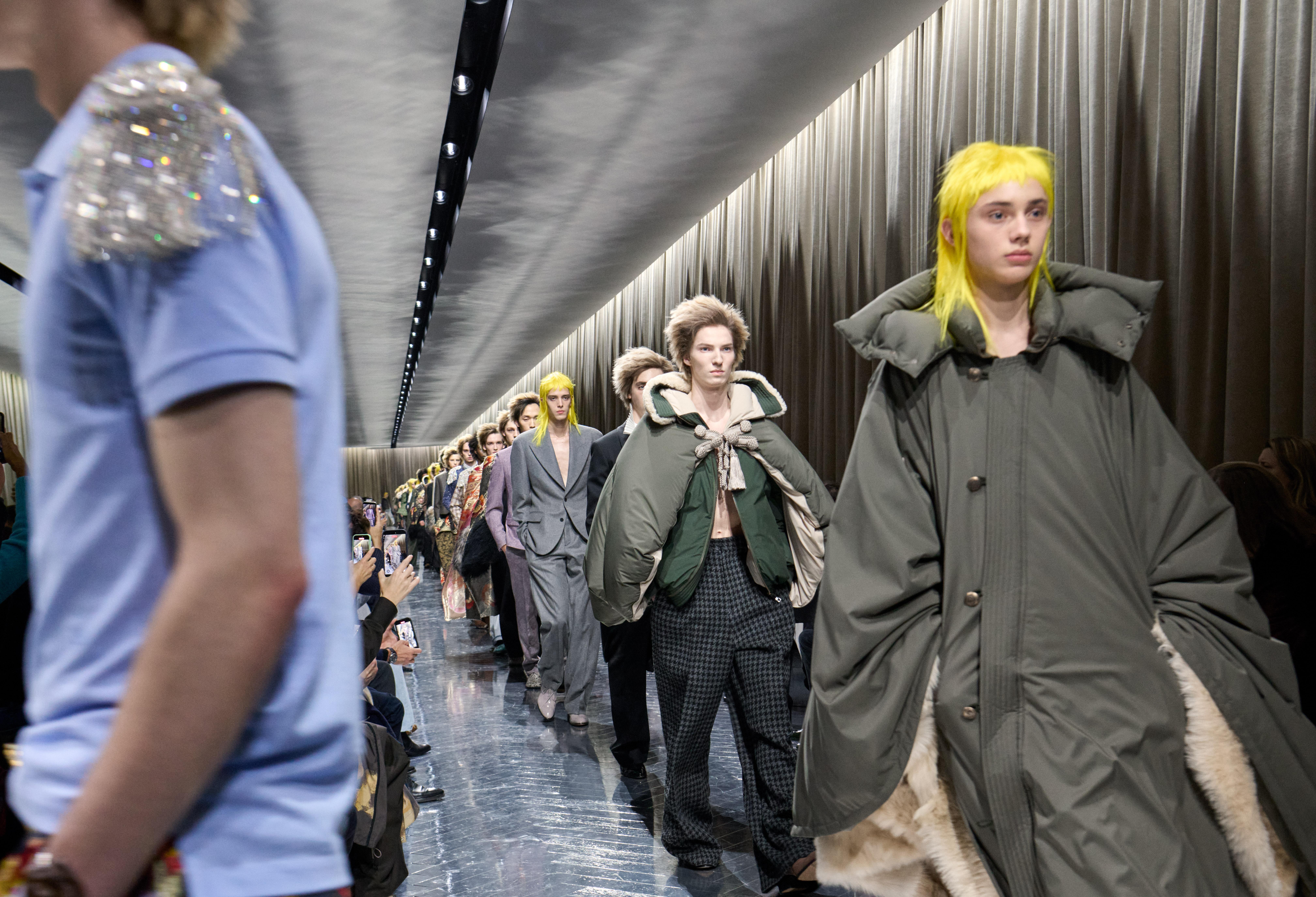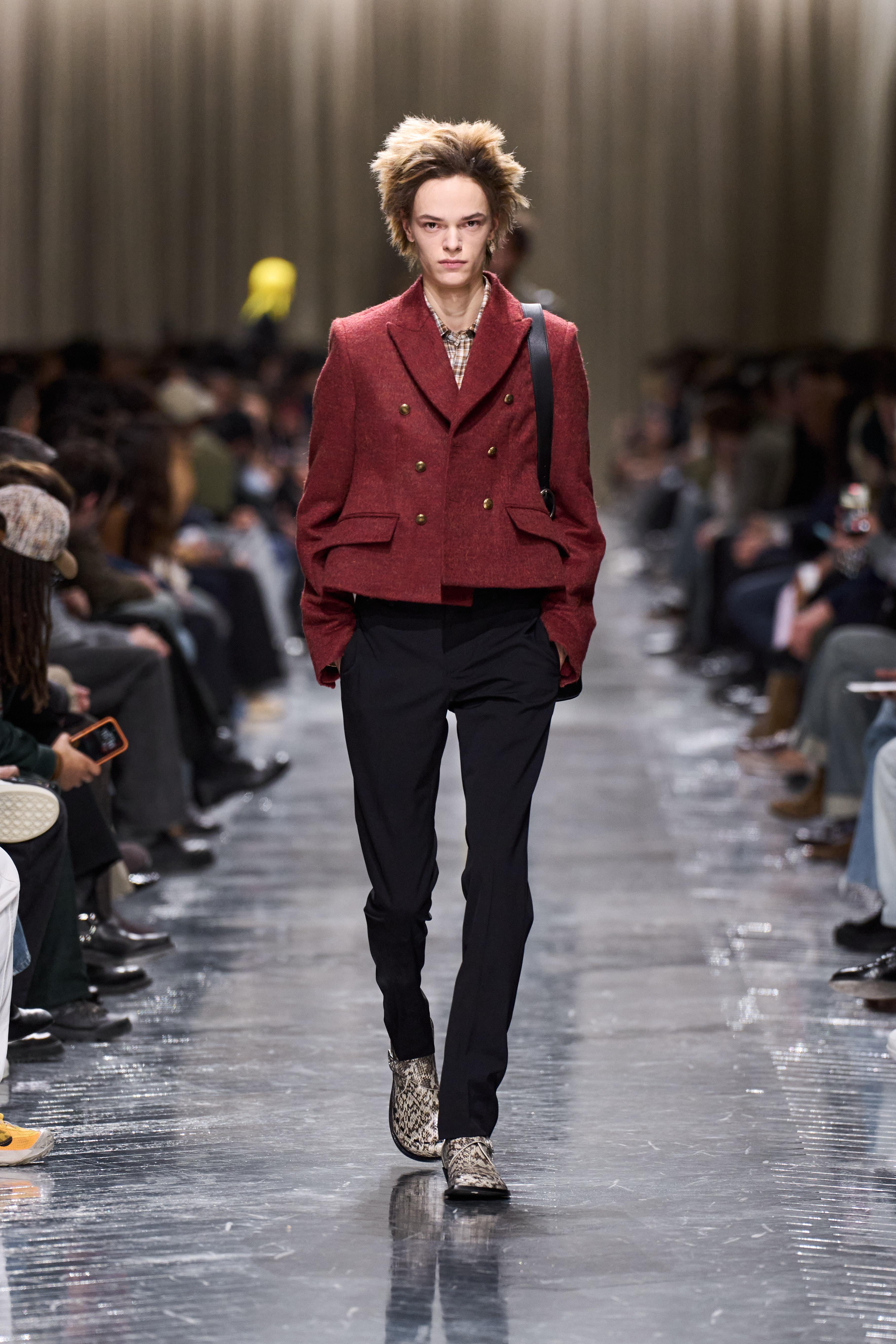 於是我們在羅丹美術館看見 Jonathan 將這份自由注入每個設計之中。亮片背心截取自 Poiret 1920 年代長禮服的上半部輪廓,配上水洗牛仔褲,優雅被稀釋,叛逆被提純。軍裝肩章以水鑽重新詮釋,落在波羅衫上;雙排金屬扣長進牛仔褲縫線裡;飛行夾克延展為錦緞斗篷,野戰夾克發展出氣球背輪廓。那位頂著金黃爆炸頭、肩披刺繡肩章的漫遊者,看起來既像 70 年代搖滾明星,又像剛從 Dior 高訂沙龍走出來的貴公子,這兩種身分,看似衝突,卻意外和諧。