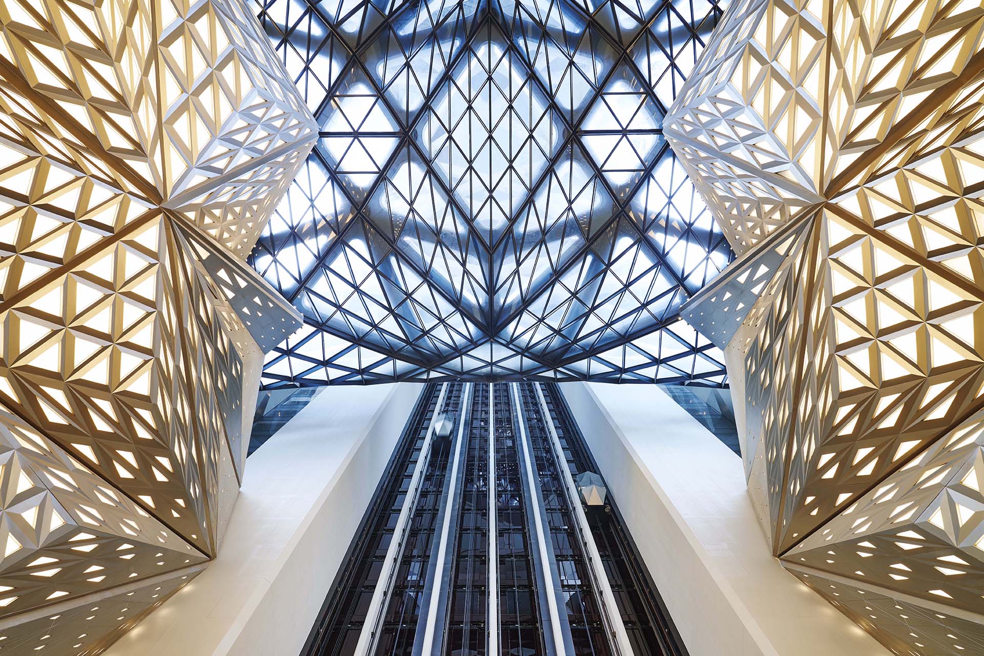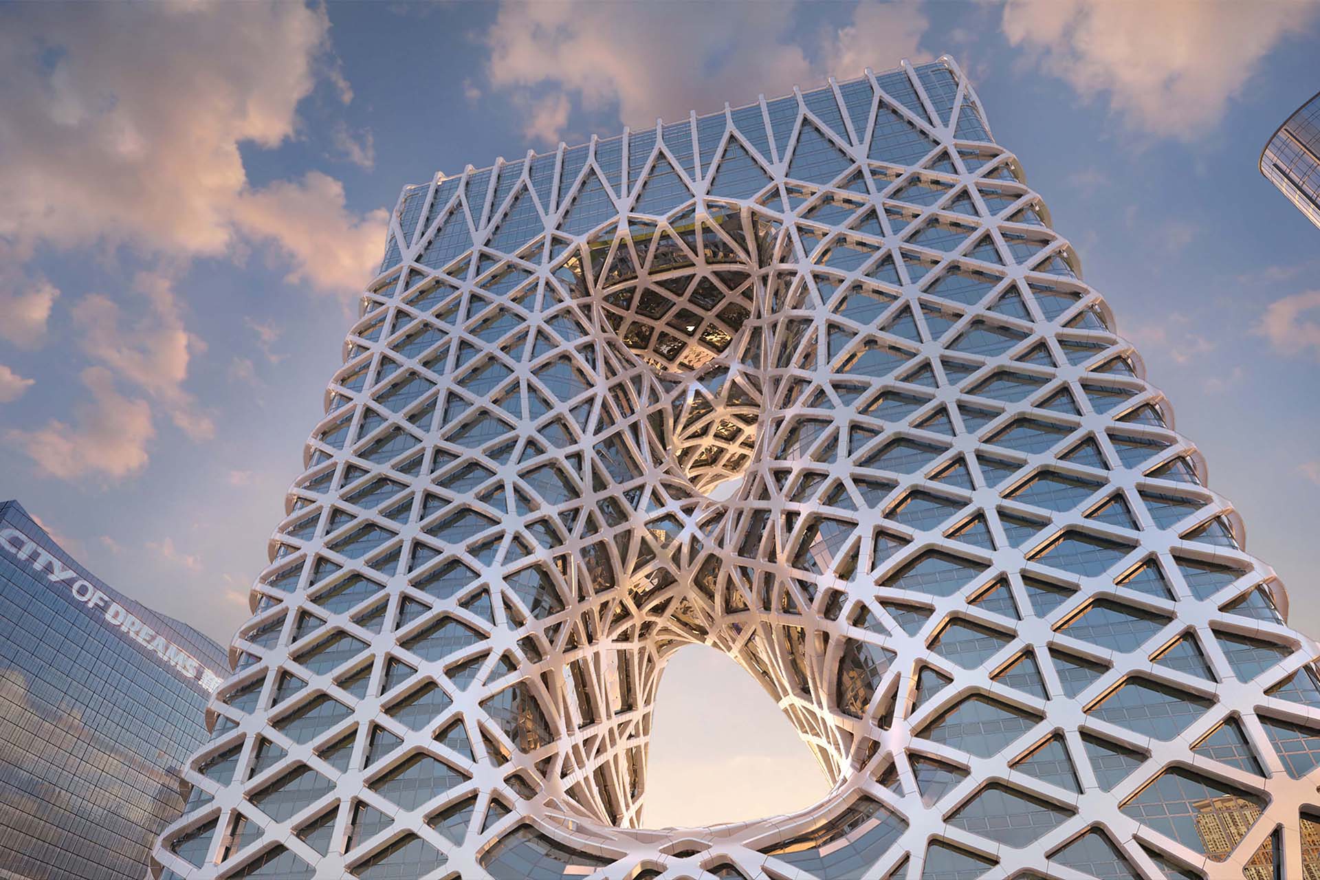 繼續往裡走,你會進入Zaha Hadid的最後遺作──Morpheus摩珀斯酒店。全球首座自由形態外骨骼超高層建築,40米挑高中庭,弧形天橋在空中切割光線。這棟建築沒有一條筆直的線,彷彿整個空間都被一股巨大的力量強行扭曲──這正是人類對宇宙最終極的想像:劃開既有的空間,探索未知的可能。