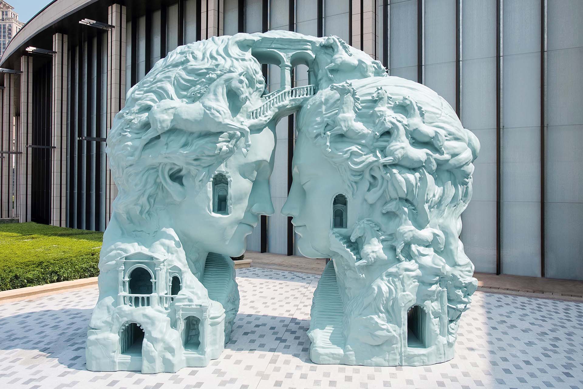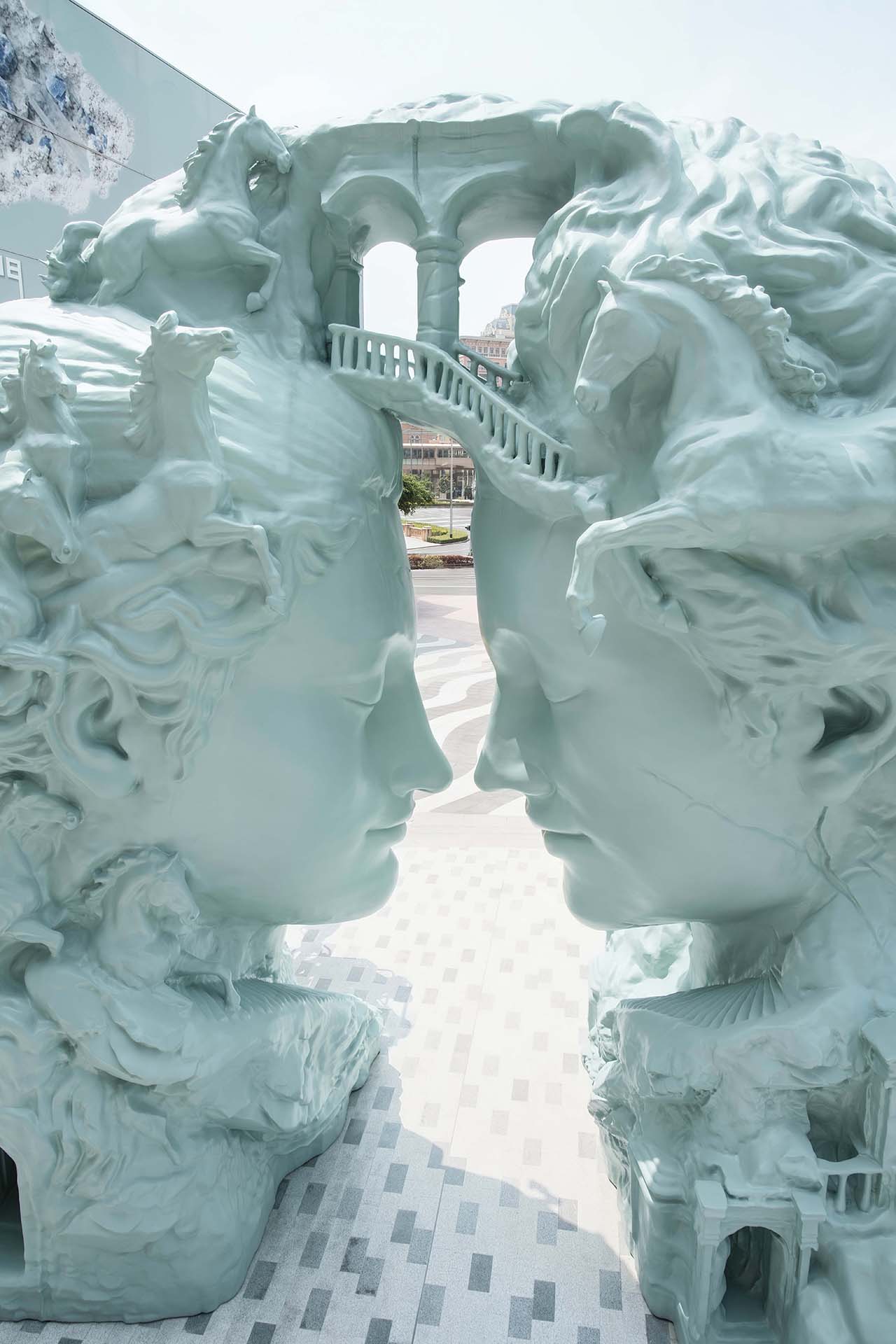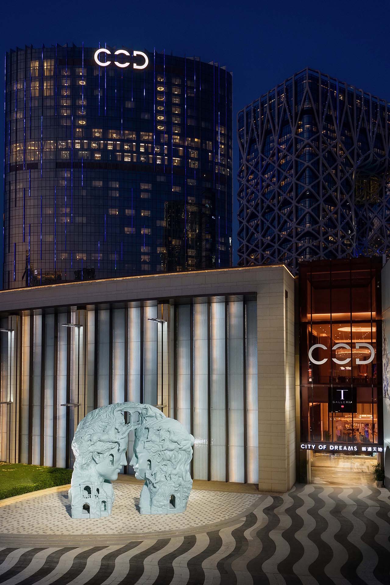 別誤會,新濠天地當然本來就有門,但這道新的門卻很不一般──這是美國當代藝術家Daniel Arsham為新濠天地定製的《夢幻之門》。這道門由兩座巨型頭顱相對而立,沉默又近乎冷冽,但走近一看,內部被精細鏤空成錯綜複雜的迷宮,無數階梯在頭顱裡盤旋,微型人影在其中漫遊,找不到哪裡是起點,當然也沒有終點。你無法真的走進去,卻忍不住想像,如果可以的話,那些樓梯會通往哪裡。