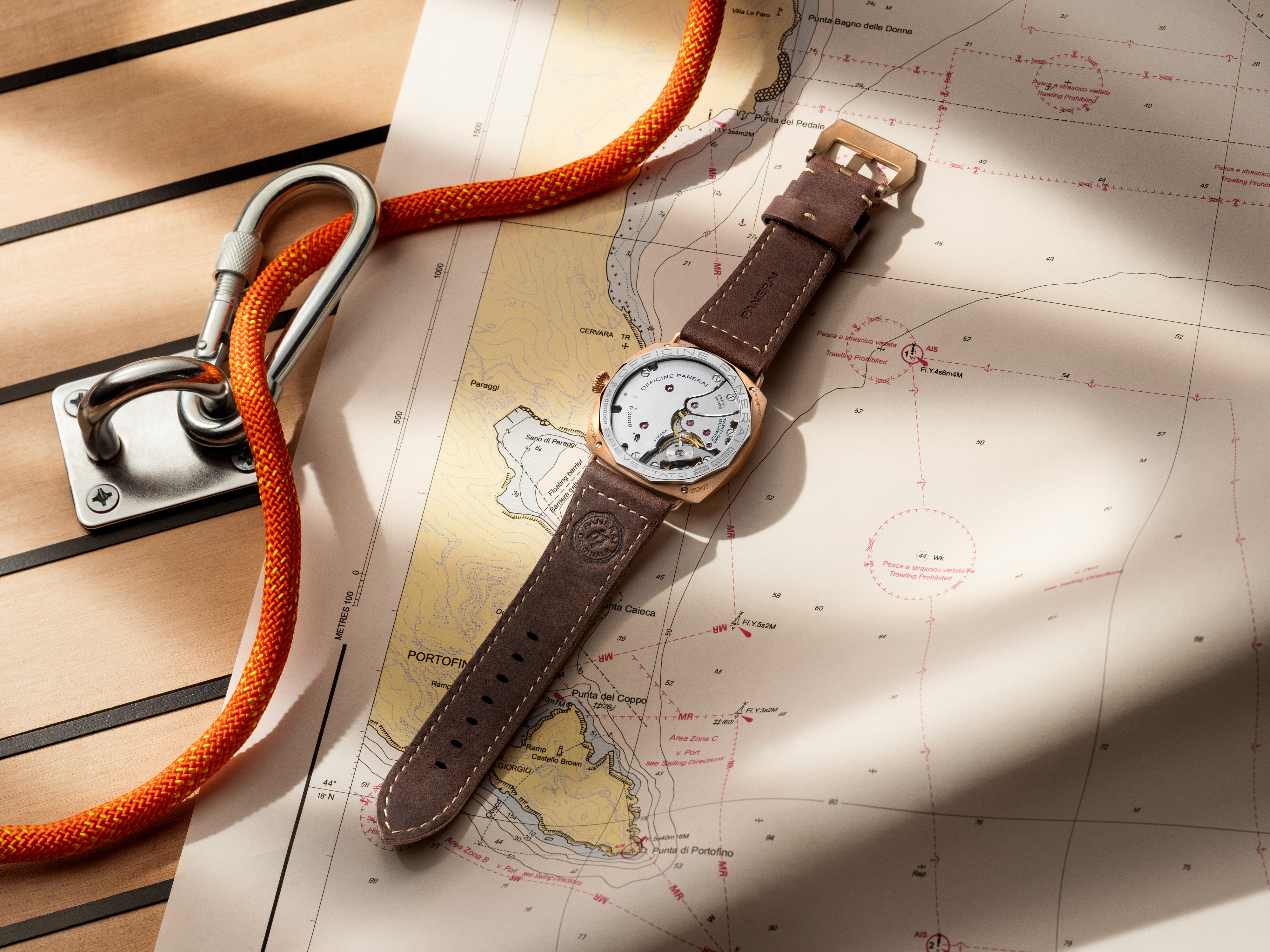 錶盤搭配圓弧形PLEXIGLAS®樹脂玻璃鏡面,進一步增加整體的復古魅力,也承襲早期Panerai專為義大利海軍打造、備有Radiomir 光錶盤的潛水錶設計。鈦金屬鏤空錶底蓋則搭配藍寶石水晶玻璃鏡面,能將精密的P.3000機芯盡收眼底,此機芯由Panerai位於瑞士諾沙泰爾的錶廠研製,提供長達三日的動力儲存。經過特殊處理的深棕色皮革錶帶則搭配梯形青銅針扣,帶有懷舊質感,呼應Panerai早期因軍事機密而未曾公開的歷史腕錶。