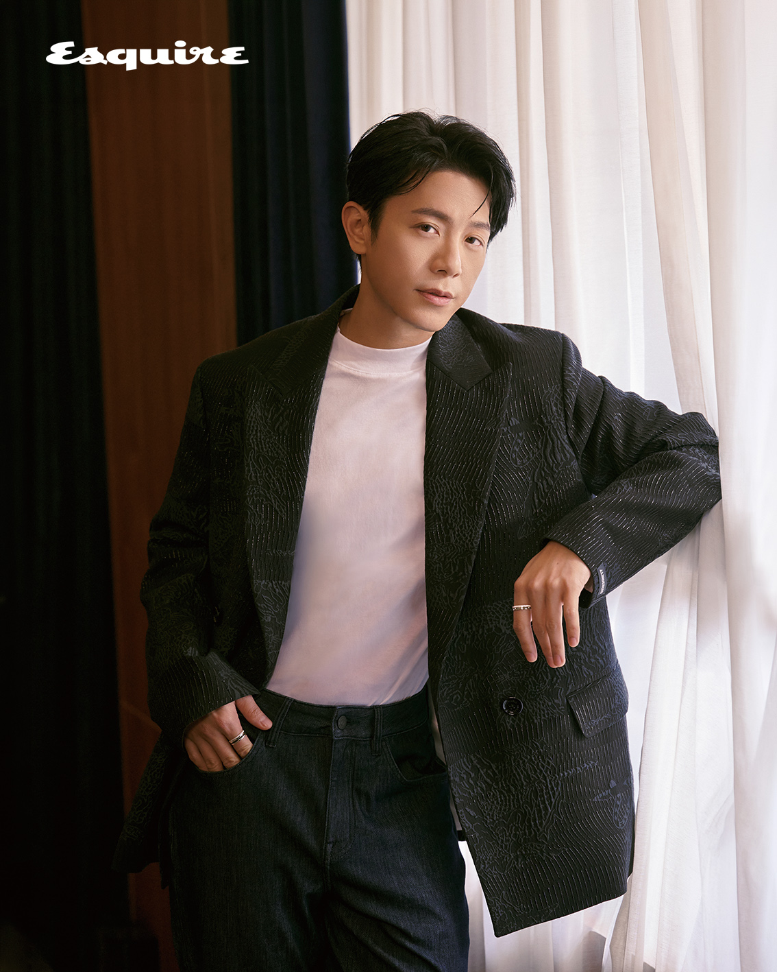 WISE系列立體亮紋獵裝外套、立領短袖上衣、牛仔長褲 by J.LINDEBREG; Quatre Black系列戒指、Quatre Classique系列戒指 by Boucheron