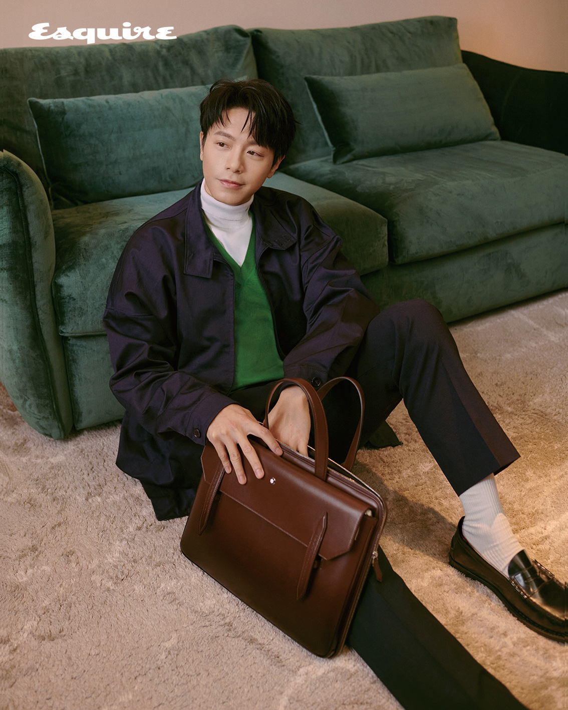 深藍色夾克、高領針織衫、V領針織衫、黑色長褲、亮面皮革樂福鞋 by Prada;大師傑作系列公事包 by Montblanc
