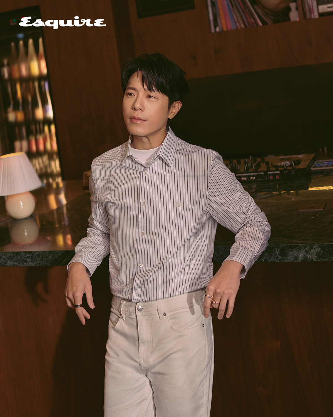 WISE系列條紋長袖襯衫、牛仔長褲 by J.LINDEBREG;Serpenti Viper系列戒指、B.zero1系列戒指 by BVLGARI