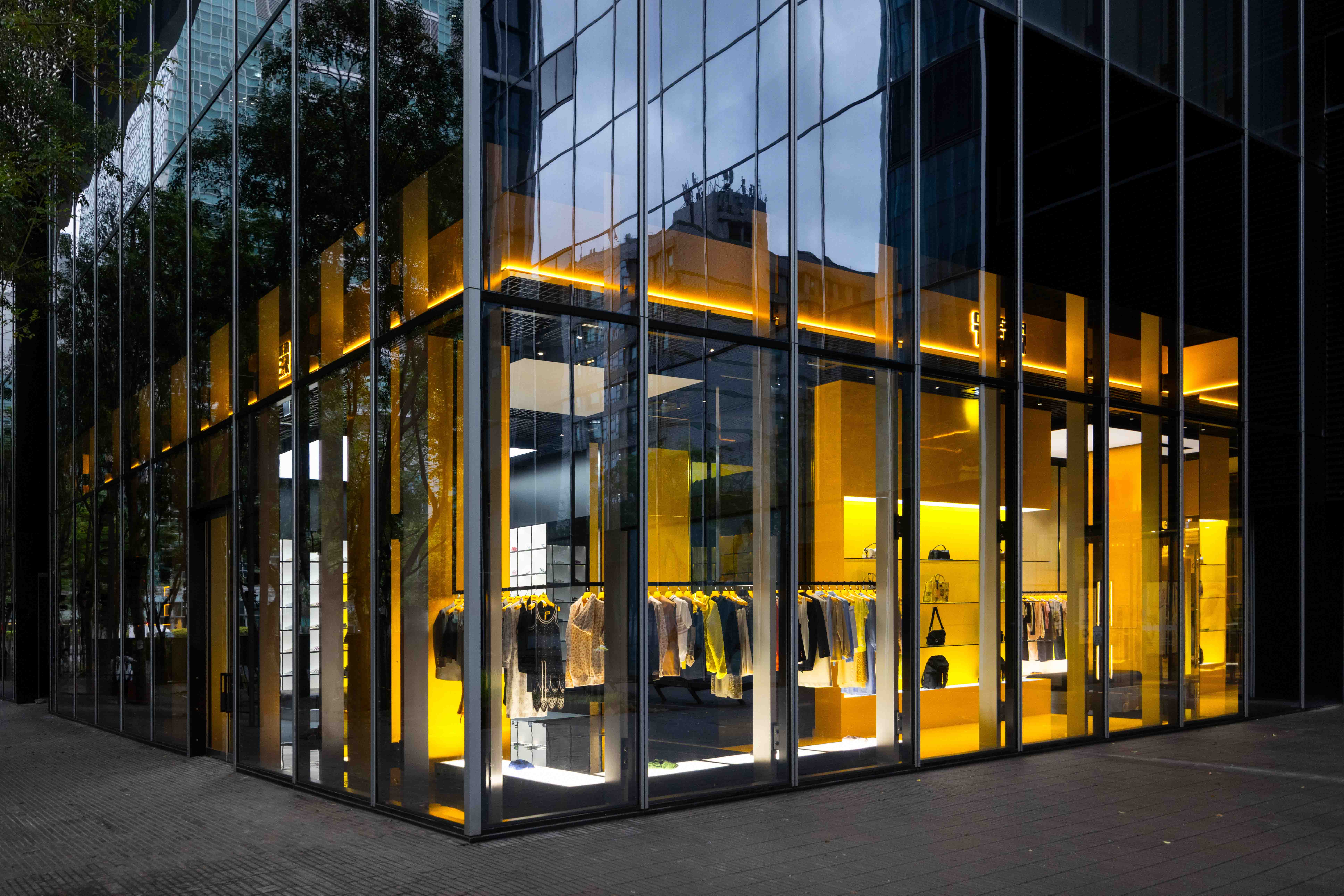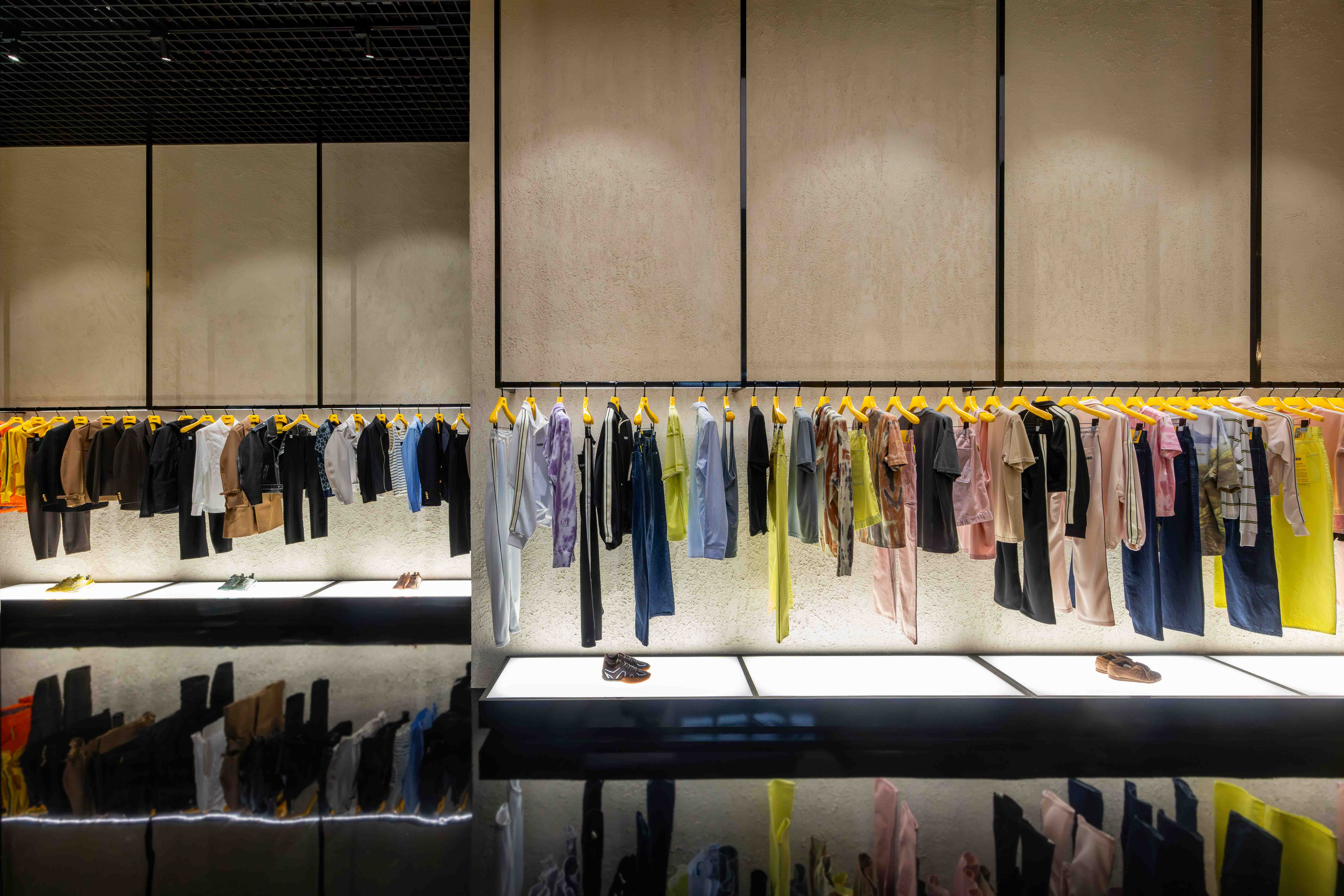 全新概念店裝風格與東京銀座旗艦店同步,大量運用具備自然紋理的石材作為主體,搭配俐落的金屬線條與光影層次,形塑出兼具現代感與工業質地的氛圍。品牌標誌性的色彩「Tiger Yellow」被巧妙地轉化為視覺焦點,在洗鍊的灰色調空間中跳脫出來,不僅建立鮮明的視覺識別,更象徵品牌從運動基因跨足高端時尚的演變。