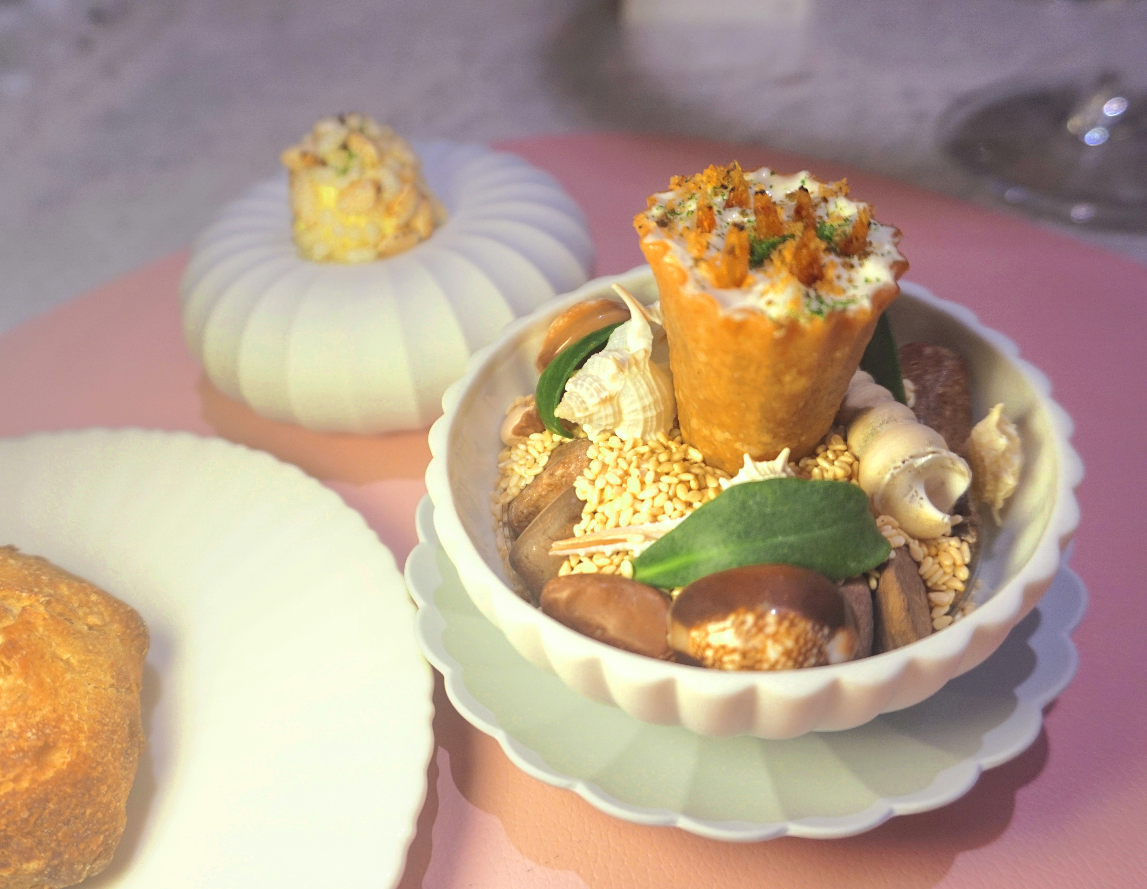 晚宴中的各道餐點則透過台灣當令食材結合法式料理技法,造就在地風情的全新感受。開場小點「春潮新序」以櫻花蝦、水蓮與鳳梨等元素帶出春天明亮的酸甜氣息;緊接著「海港時味」以東港黑鮪魚與澎湖海菜呈現海港鮮味,銜接「海風日藏」澎湖軟絲與日曬乾物交織出海風與陽光的氣息。