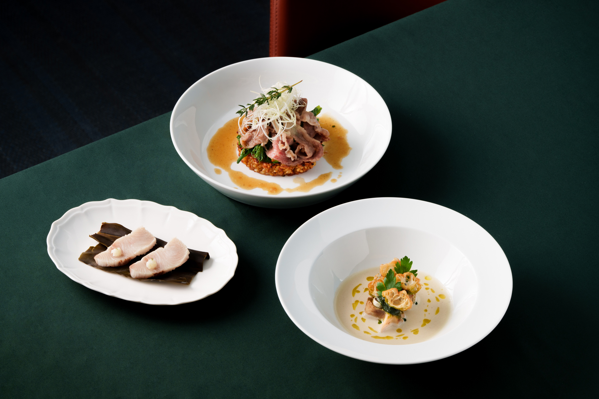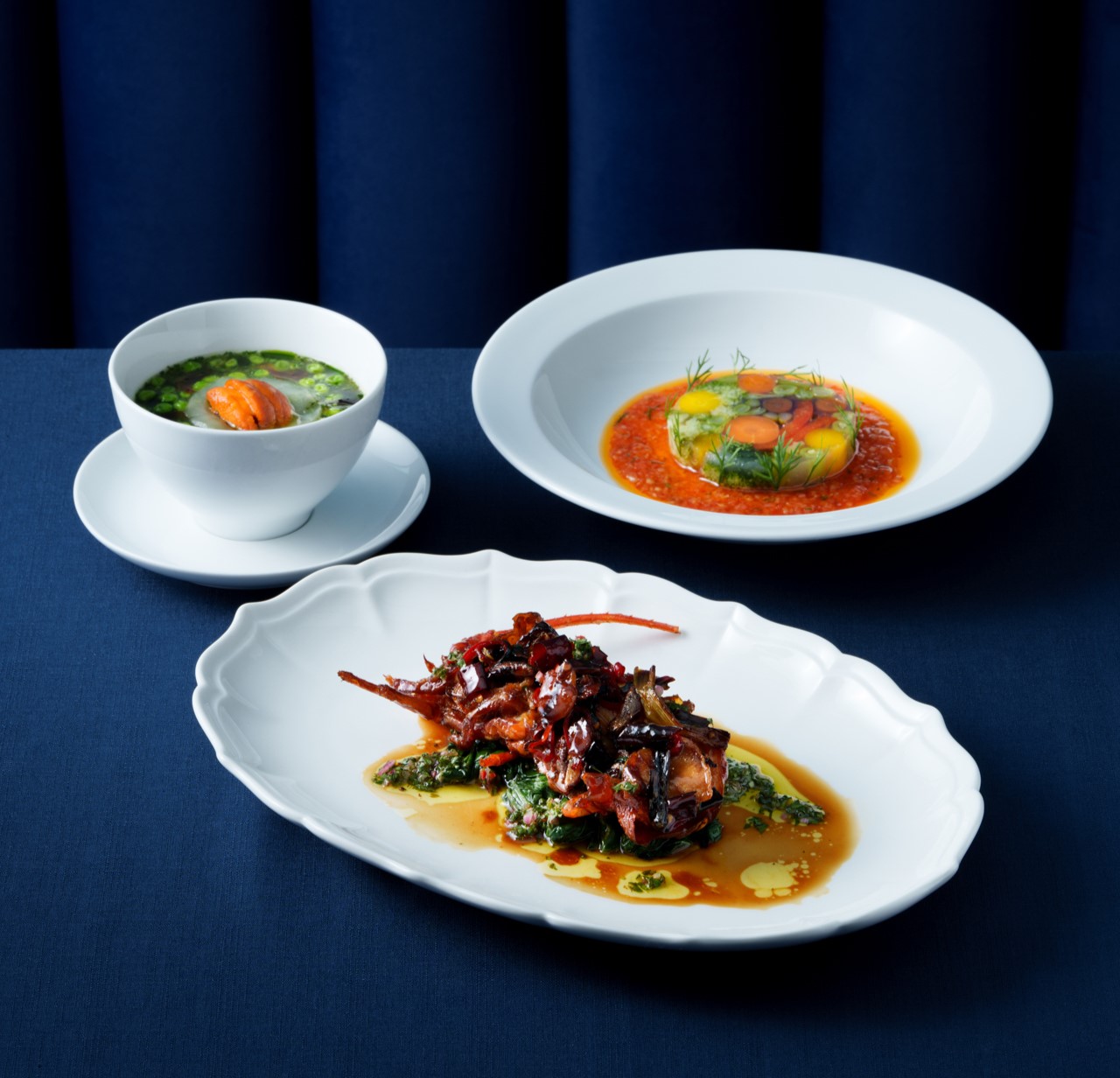 江振誠所設計archi藝廚全新菜色,左起:甜豆薄荷海膽蒸蛋、酥炸三杯軟殼龍蝦/奇米丘里地瓜葉、血腥瑪麗季節春蔬凍