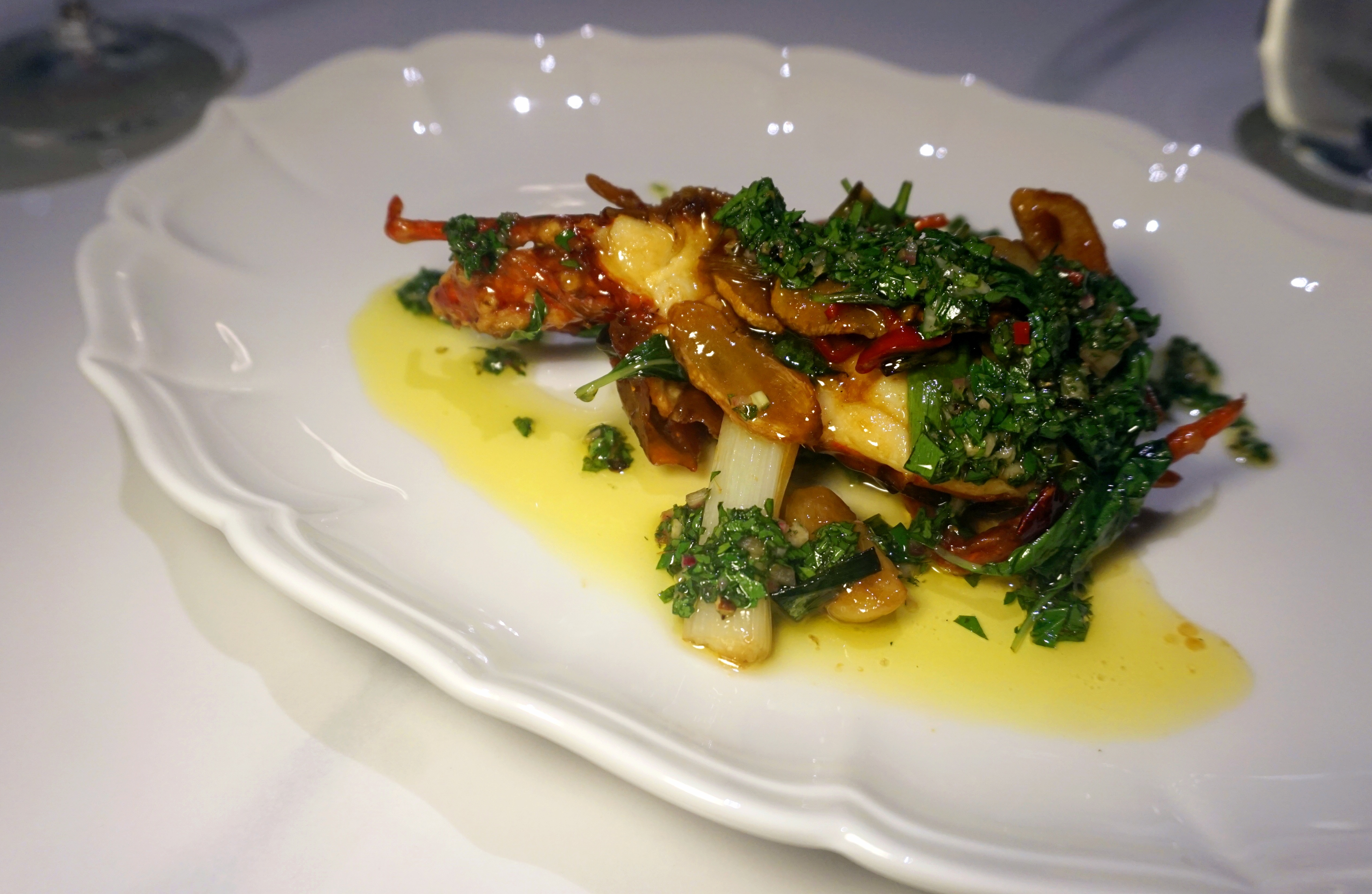 酥炸三杯軟殼龍蝦、奇米丘里地瓜葉