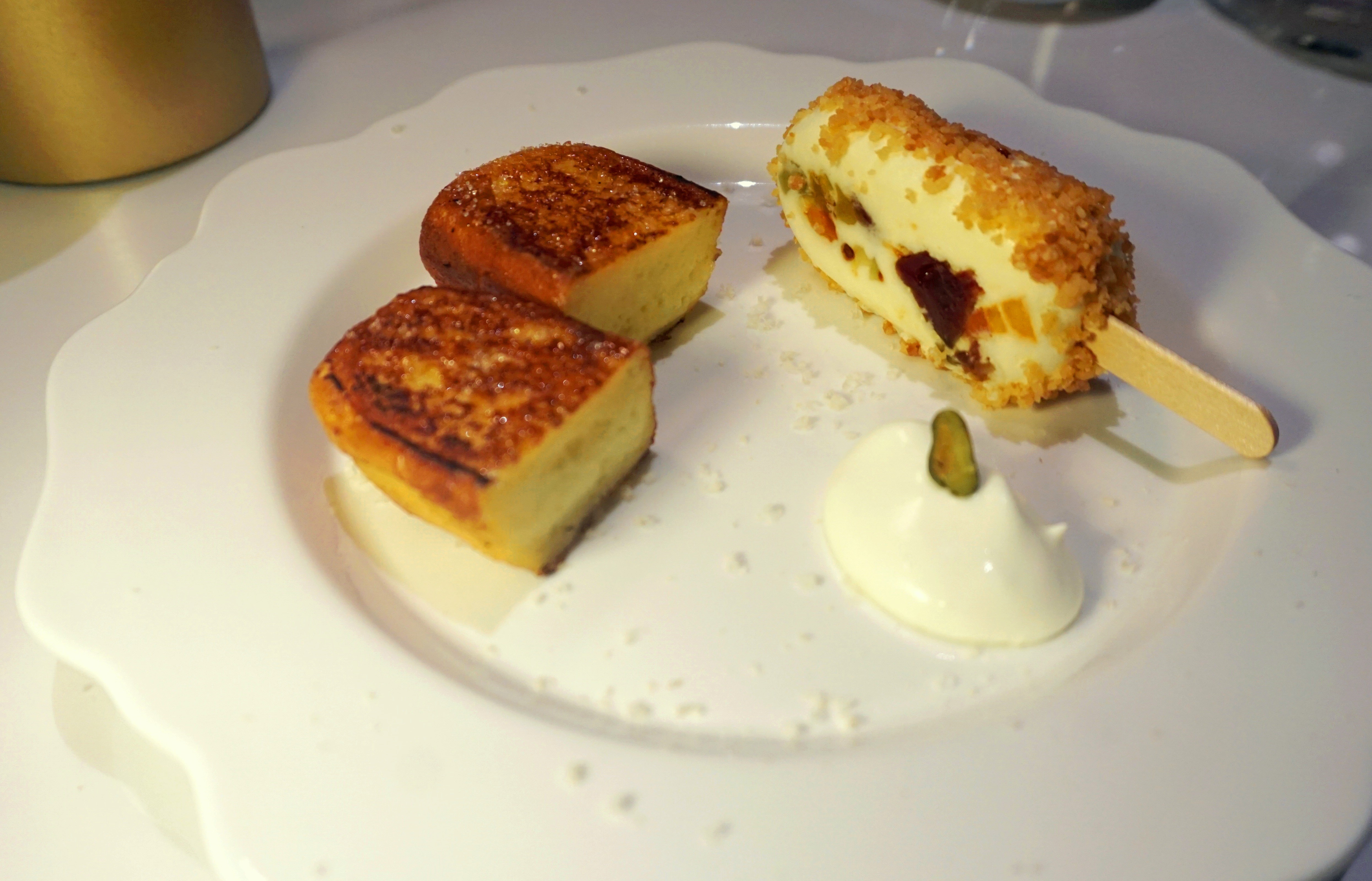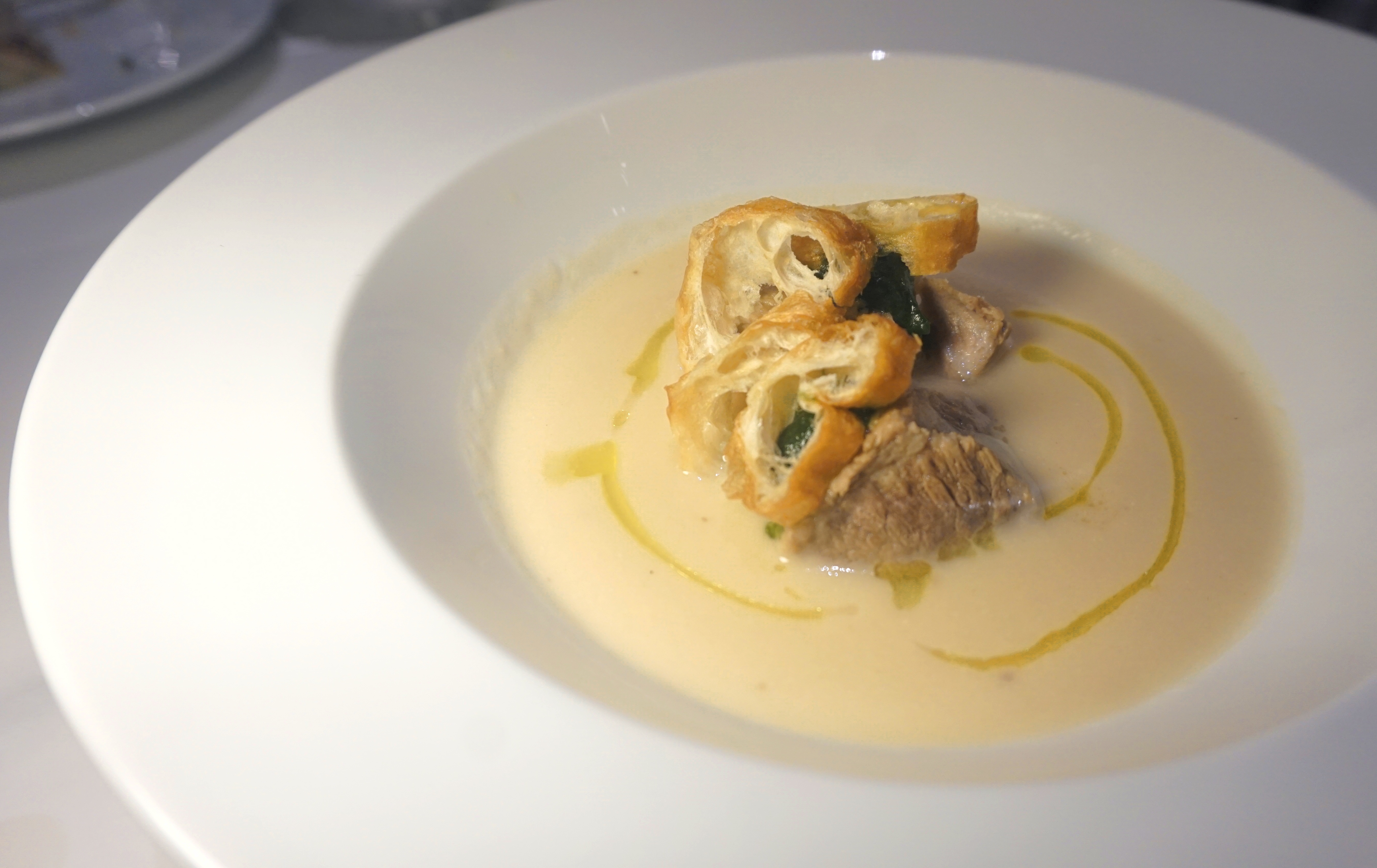 此外筆者十分喜愛的料理則是「肉骨茶胡椒濃湯配油條」,結合台式傳統的排骨蘿蔔湯、義式麵包湯Ribollita與新加坡肉骨茶做出融貫三地的經典呈現。以Ribollita的慢火工法結合肉骨茶燉煮香料精華,並以花椰菜打製成濃湯,再點綴上橄欖油及酥脆油條。口感柔滑的湯頭,入口卻是胡椒香料的南洋辛香,橄欖油令風味綴以些許明亮之感,厚實的燉煮排骨肉與替代義式麵包元素的油條,則喚醒台灣人味蕾中最家常的記憶。在新譯台、義文化外,新加坡元素的融入不僅讓風味更加豐富,同時也呼應著江振誠摘星、發跡之地,既結合了經典對話的意涵,又同時將江振誠的人生閱歷融入其間,從風味到其背後的巧思皆獨具意義。