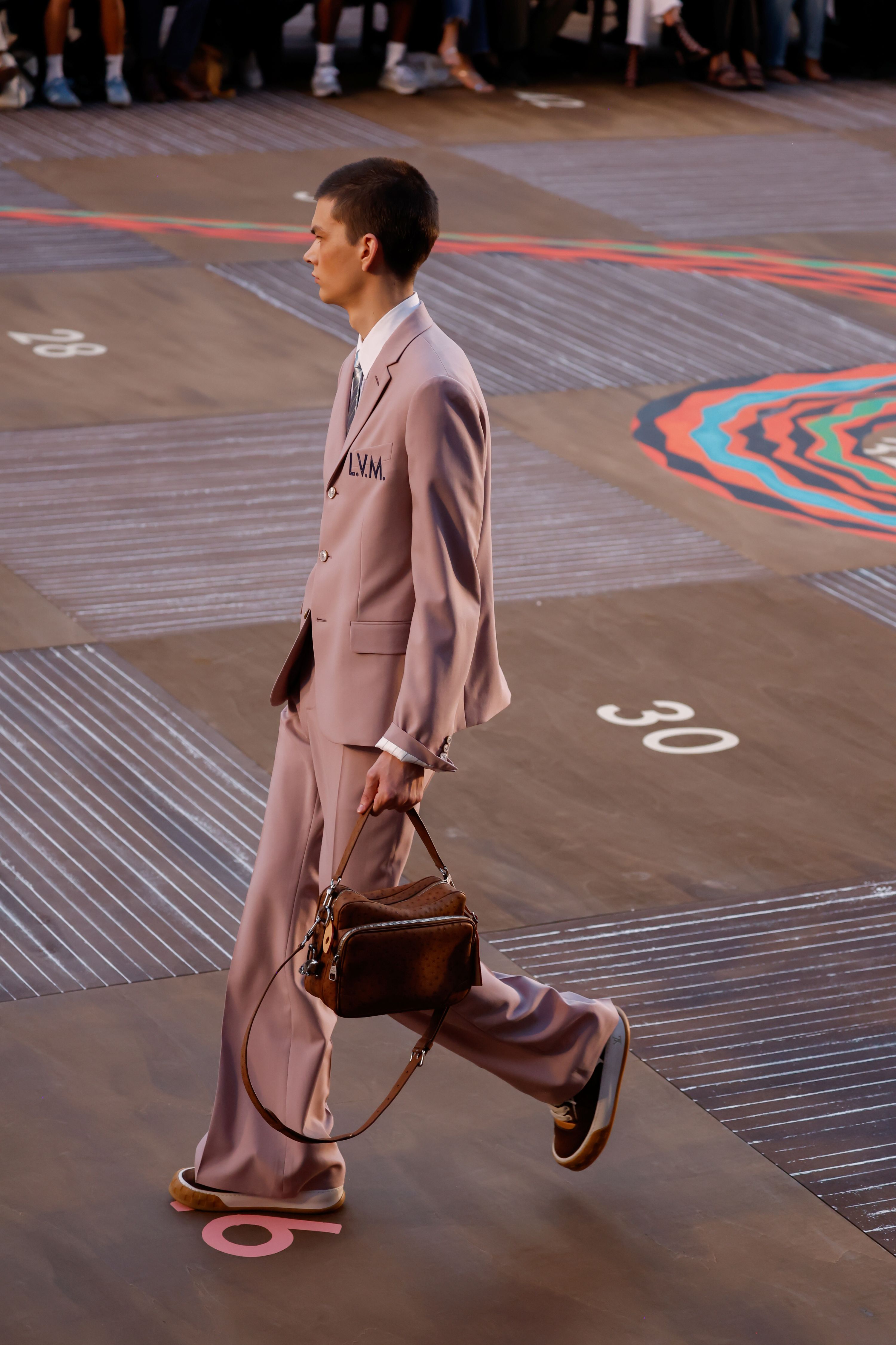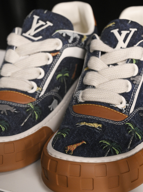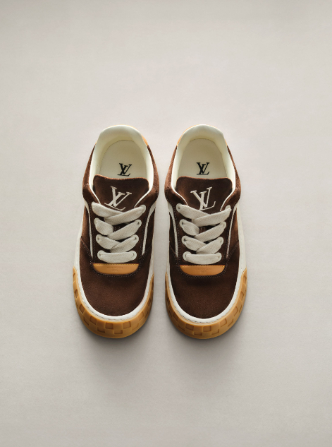 LV Tilted的名字來自鞋舌上的刺繡,它以一種「歪斜」的角度存在,展現了精準的工藝叛逆。設計團隊將滑板場上的坡道與傾角轉化為視覺語彙,那些讓身體在空中翻轉、改變方向的結構,全被濃縮成這枚歪斜的繡標裡。