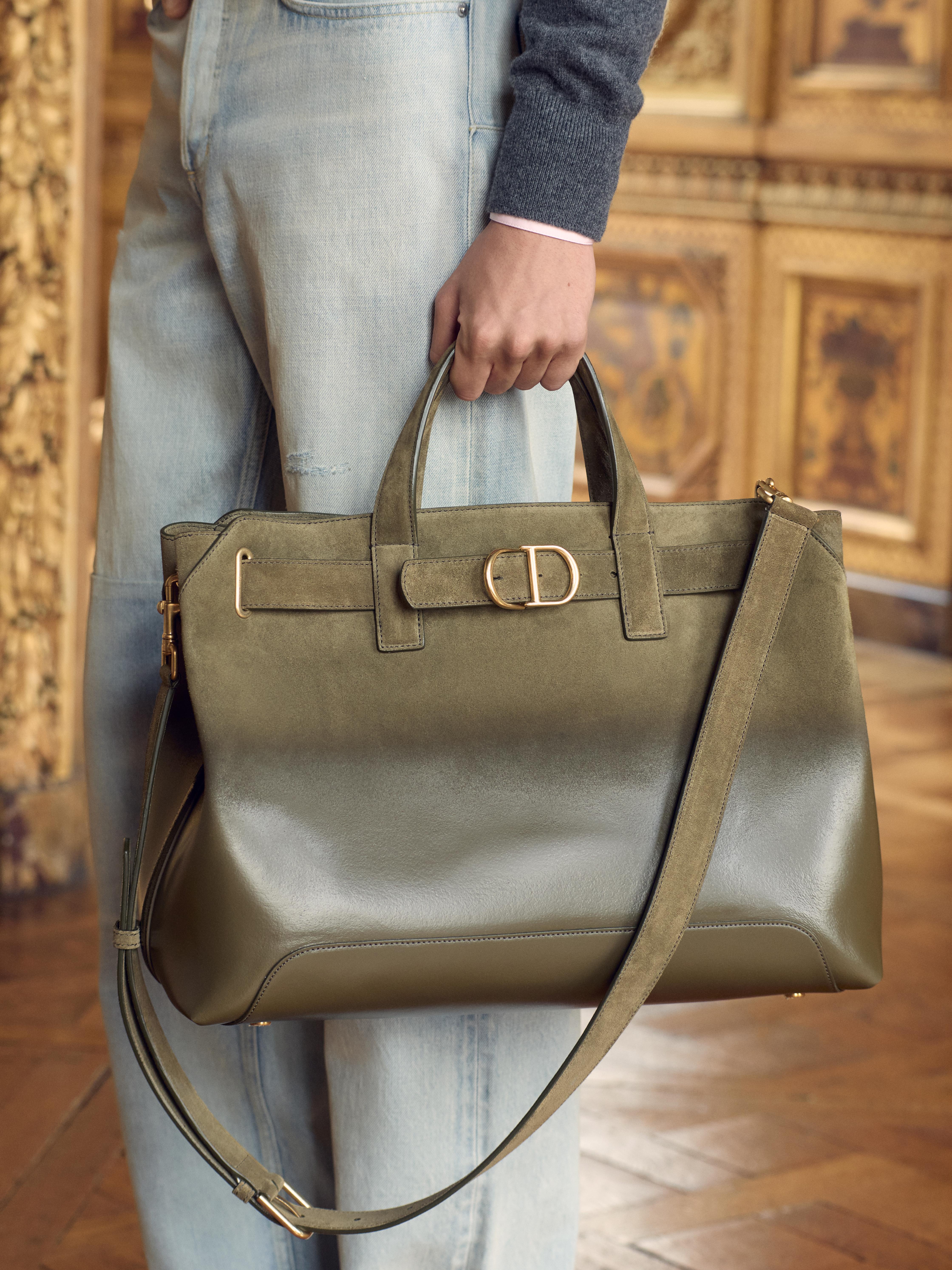 Dior Archie的流動建築感捨棄了僵硬框架,重量與弧度來自粒面皮革本身,軟、寬裕,卻自然站得住形。可調式拱形提把是整個包款的敘事核心,「CD」金屬扣環落,巧妙呼應系列裡中古世紀拱廊與徽章的語境。搭配長大衣,捕捉了當下那股滿溢的瀟灑氣息:日常的,但不輕率,形塑當代男士最自在的姿態。