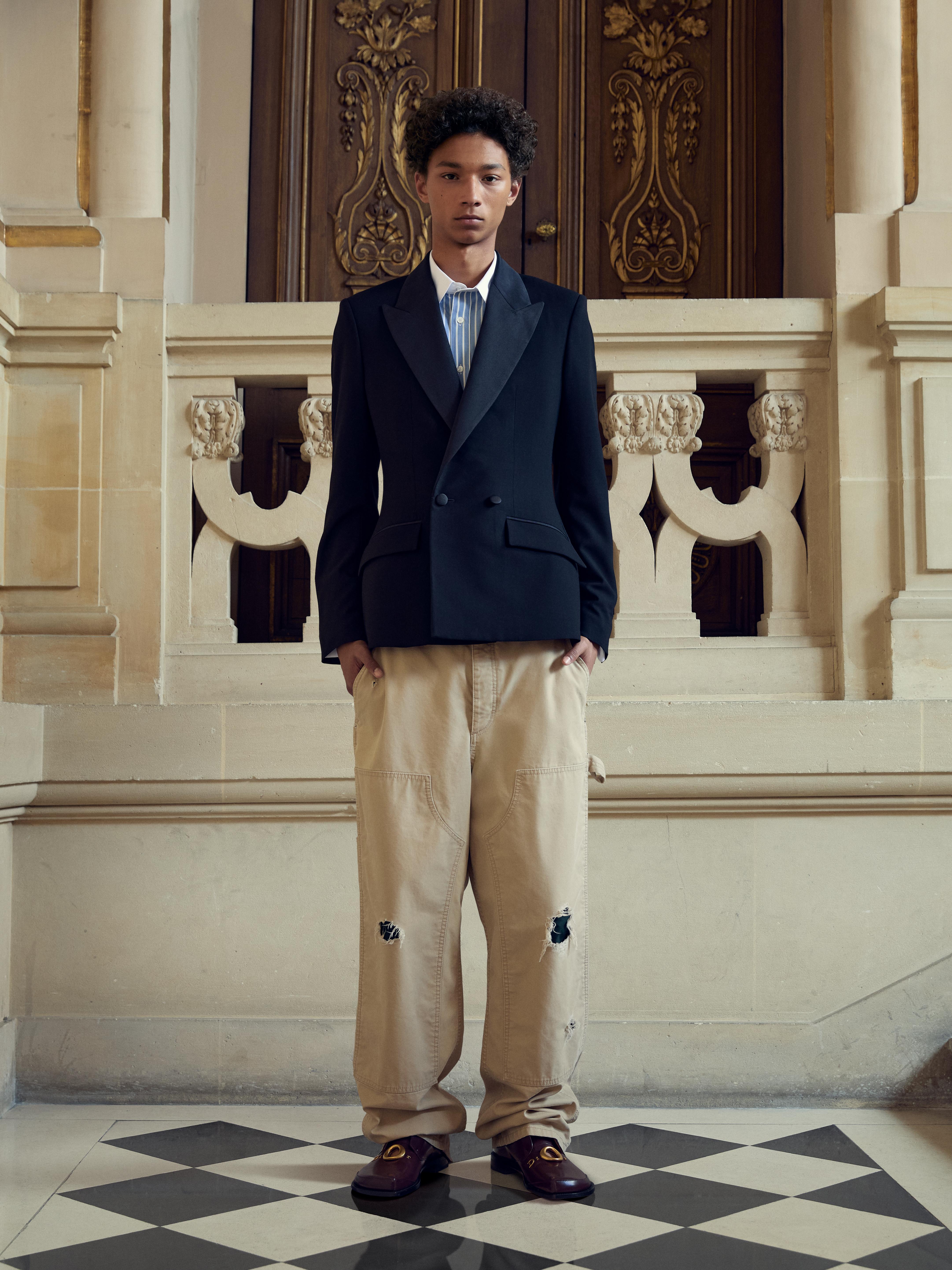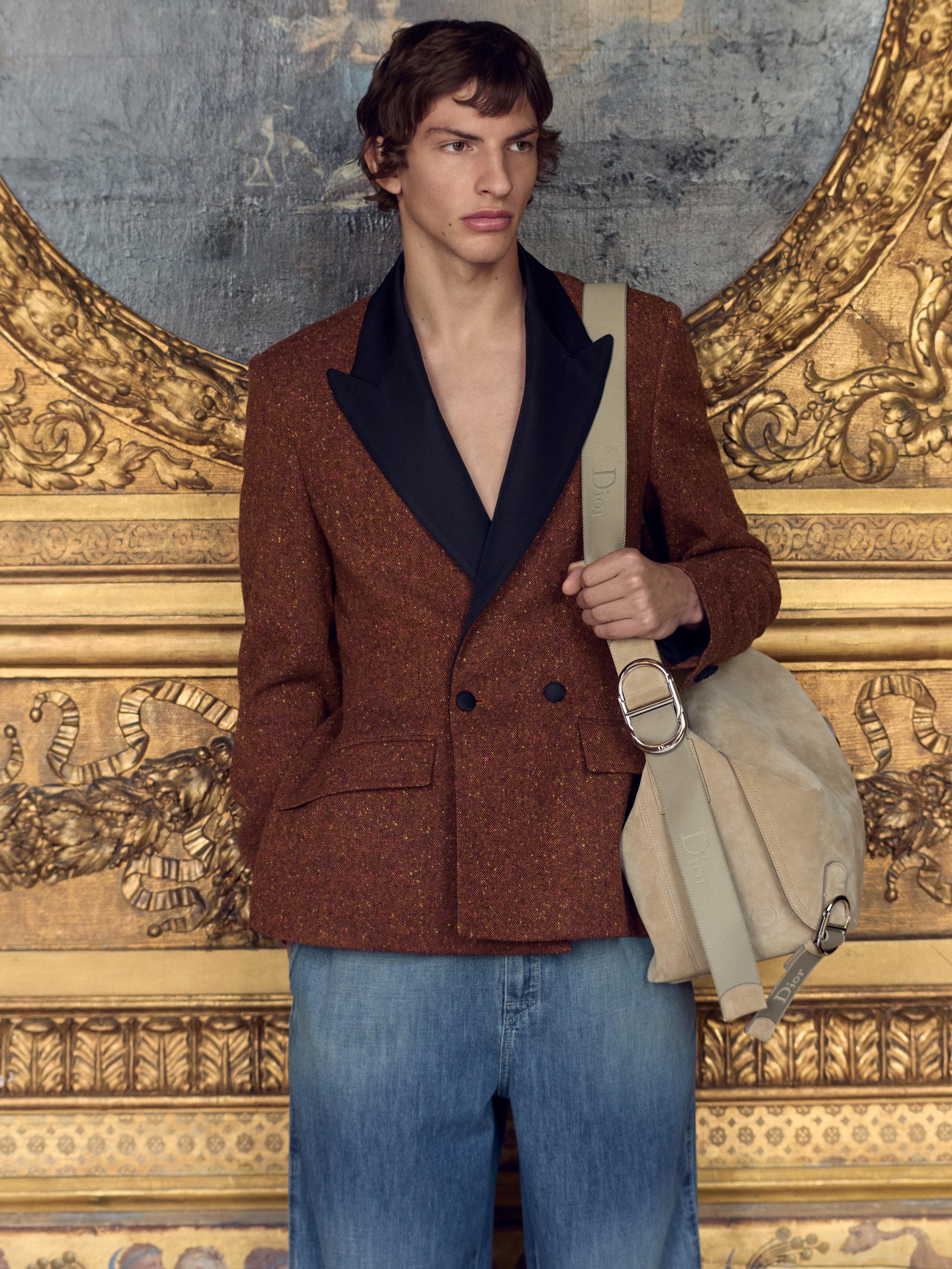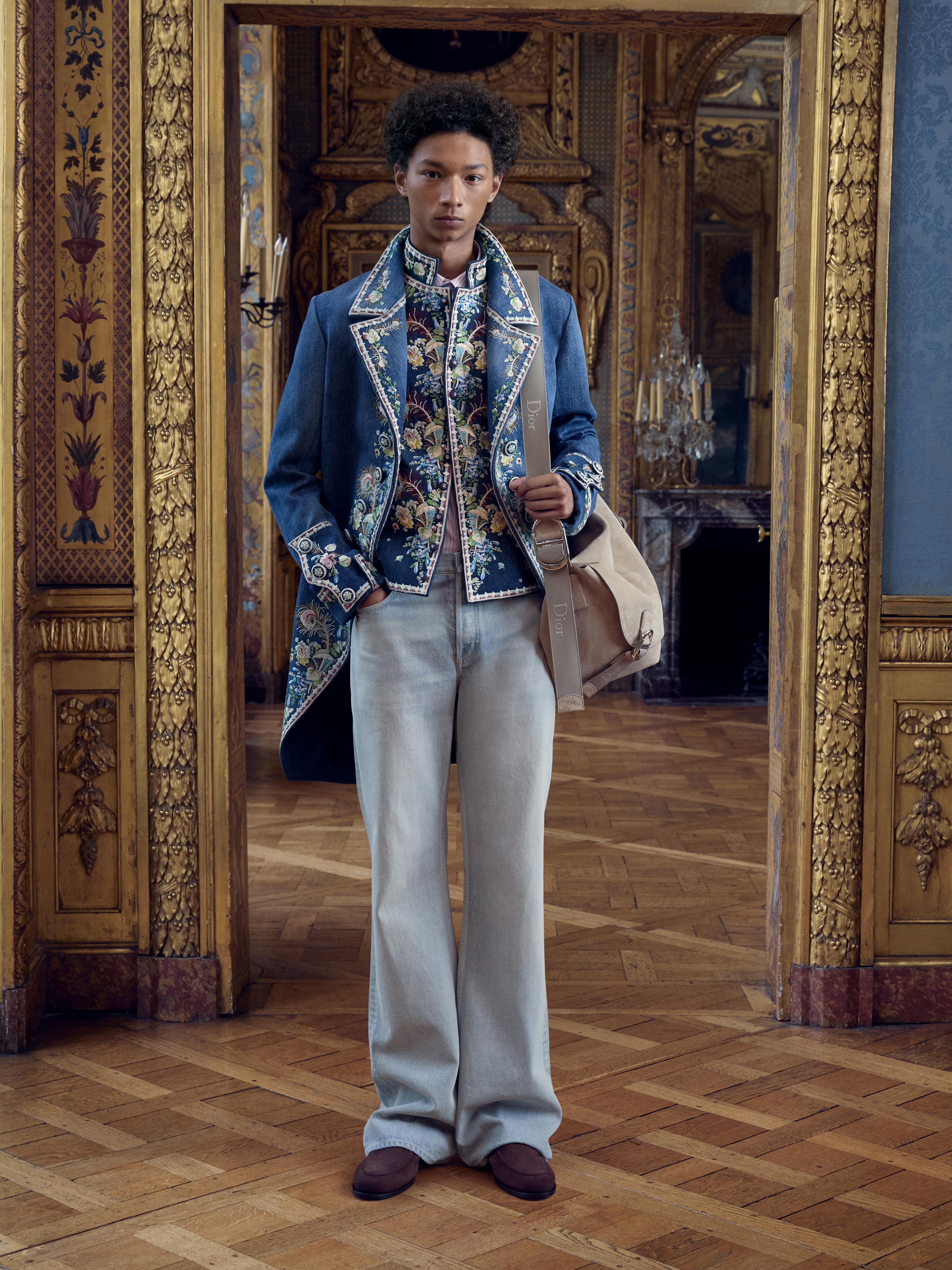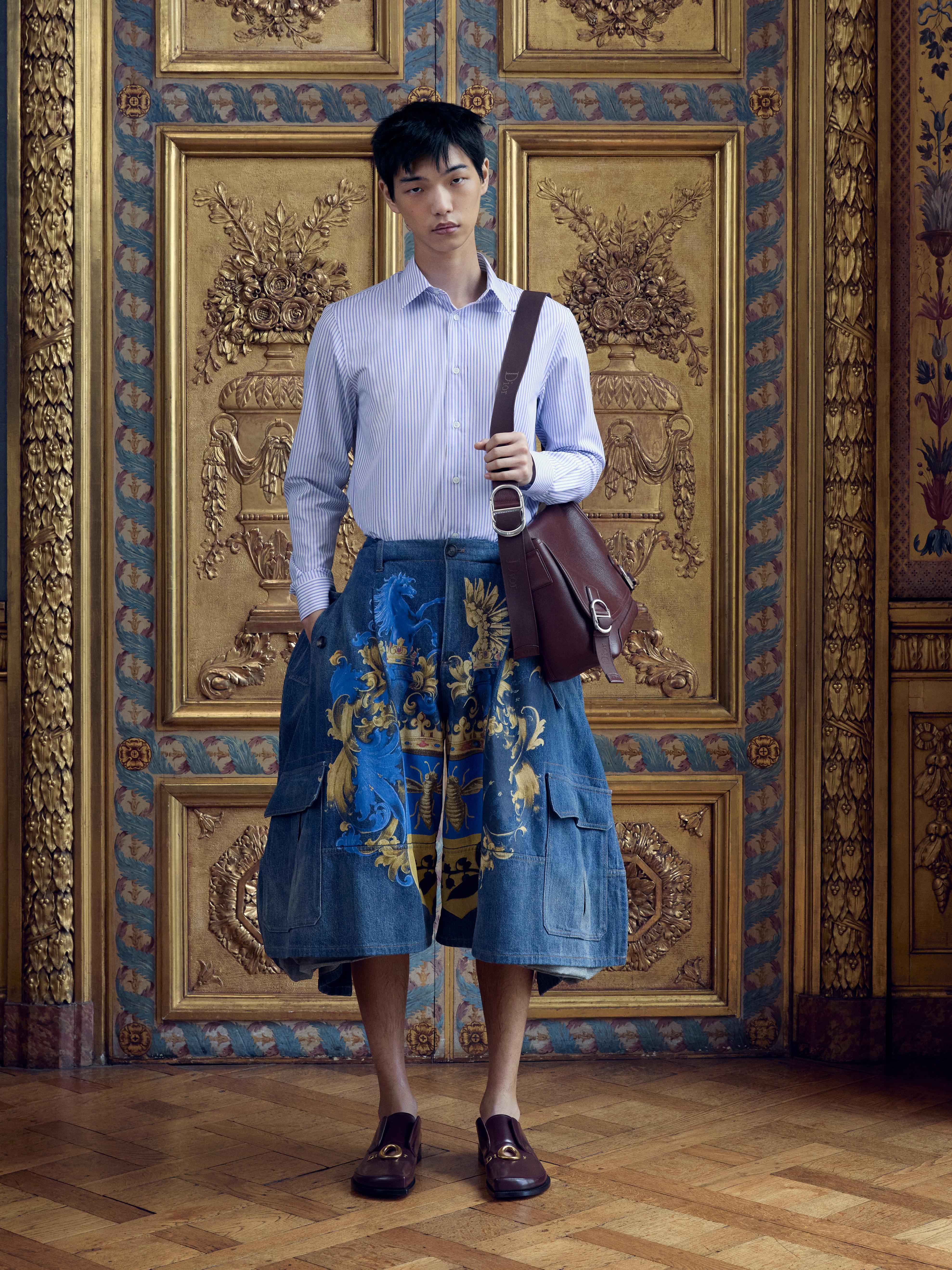Jonathan在Dior檔案庫裡進行了一場時序錯亂的實驗,洛可可式的繁複筆觸落在中古世紀徽章語境之上,載體卻是美式丹寧與英式Donegal羊毛呢。材質代表的階級不是被推翻,而是被重新分配,從小型刺繡、帶有洛可可風格的Diorette裝飾,到放大呈現的家徽印花,最具代表性的Bar Jacket與寬鬆的Delft印花短褲並行,燕尾服以丹寧重塑後褪去儀式感,剩下的是更誠實的穿著狀態:莊重與隨性不再互斥,而是同一個角色在同一天的兩種心情。